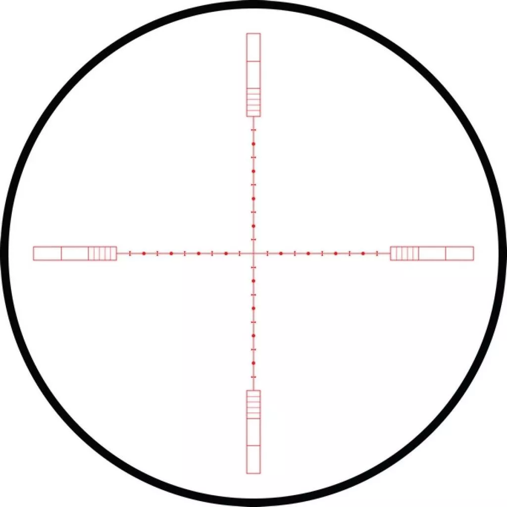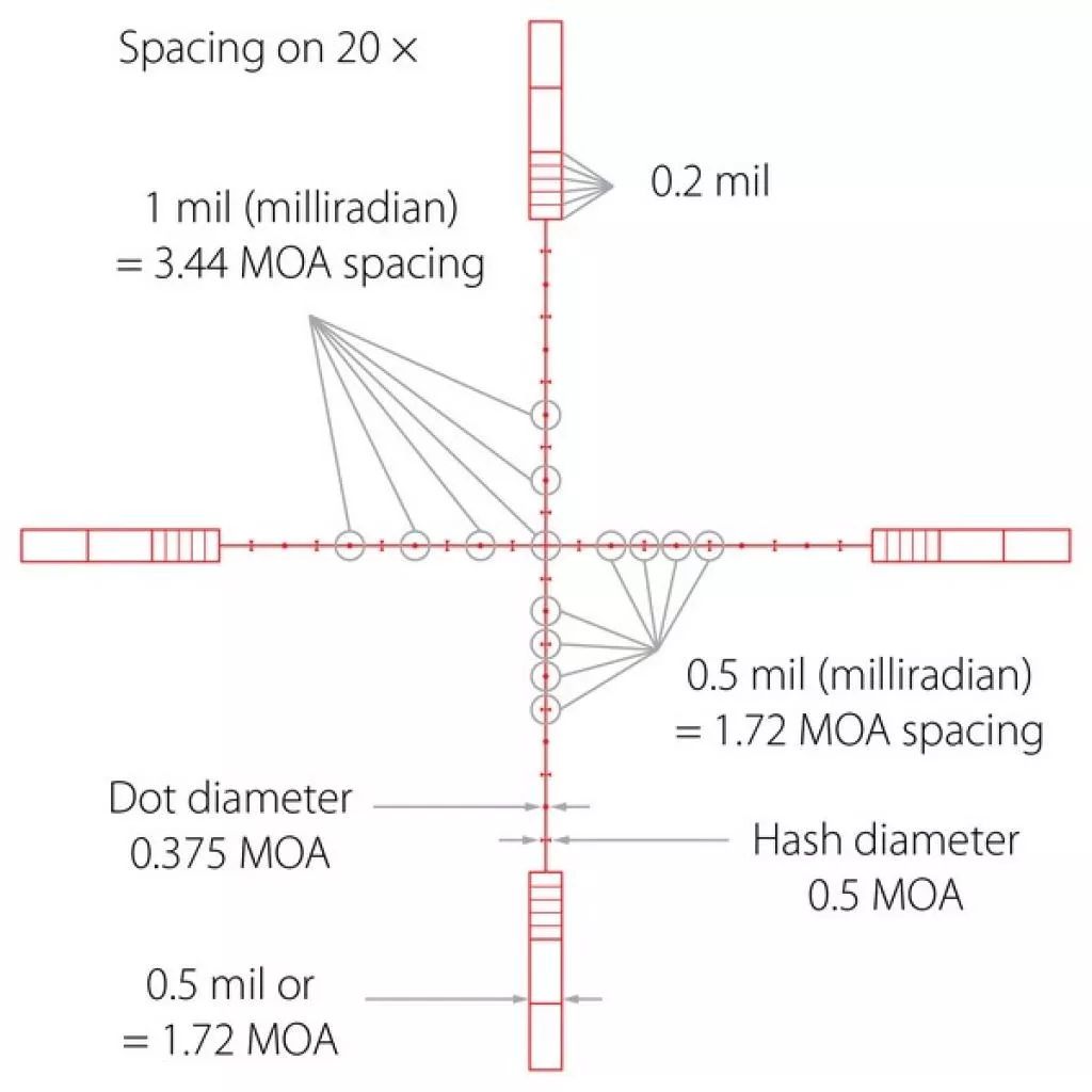 10х 1/2 Mil Dot IR - удобная универсальная сетка для максимально точного прицеливания на различных расстояниях. Главное отличие от обычной прицельной марки Mil Dot состоит в том, что тут имеются дополнительные пересечения, отмечающие пол мила. Все компоненты этой сетки имеют строго регламентированные размеры, расстояния между всеми элементами также регламентированы. Благодаря этому не проблема определить расстояние до цели либо ее размеры, приняв при этом правильную поправку на ветер и определить траекторию падения пули. Данный 1/2 Mil Dot верен при 10-кратном увеличении. Для других увеличений линейные и угловые размеры определяются методом интерполяции, либо по специальным таблицам. Персональную адаптацию сетки под конкретное оружие и тип снаряда позволит совершить бесплатный баллистический калькулятор X-ACT.