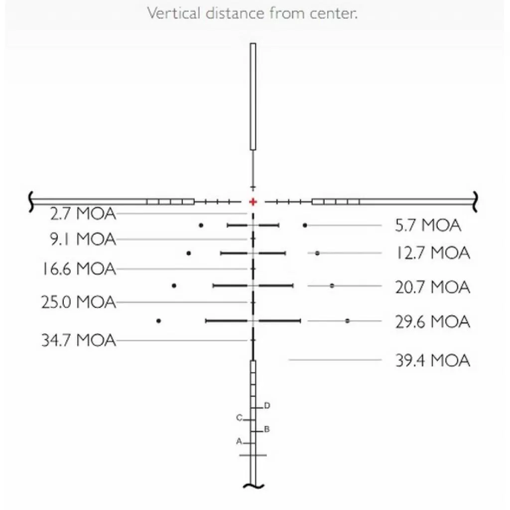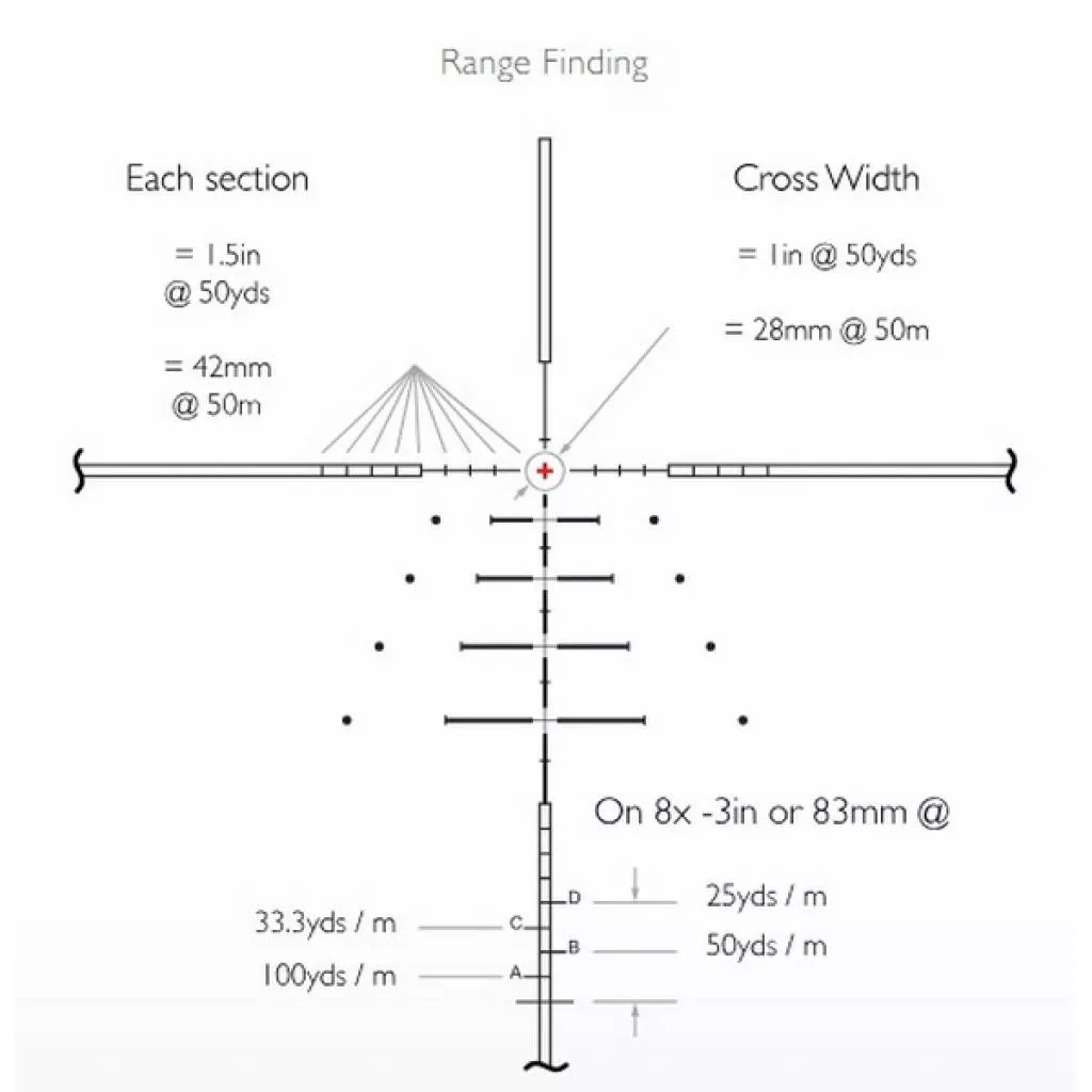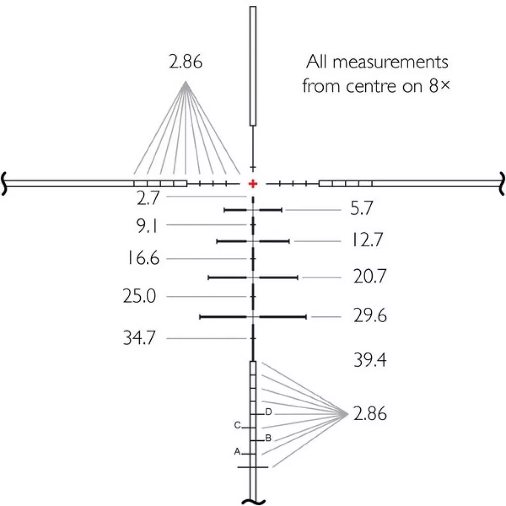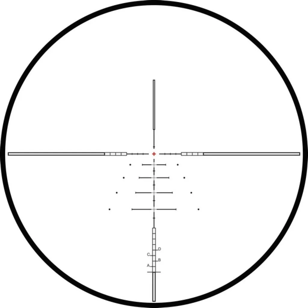 SR PRO IR - это функциональная дальномерная сетка, эксклюзивно разработанная компанией Hawke Optics, которая будет удобна для стрелков, детально работающих с траекторией полета пули. Центральное подсвечивающееся перекрестие достаточно тонкое, чтоб не перекрывать цель. Боковые полые прямоугольные области служат для масштабирования местности. Все компоненты этой сетки имеют строго регламентированные размеры, расстояния между всеми элементами также регламентированы. Указанные размеры будут верны при 8-кратном увеличении. Однако сетка обеспечивает удобные точки прицеливания, независимо от используемого калибра, скорости полета или выбранного увеличения. Достаточно просто ввести все необходимые данные в бесплатный баллистический калькулятор X-ACT и получить персональные расчеты для конкретного оружия и типа патрона.