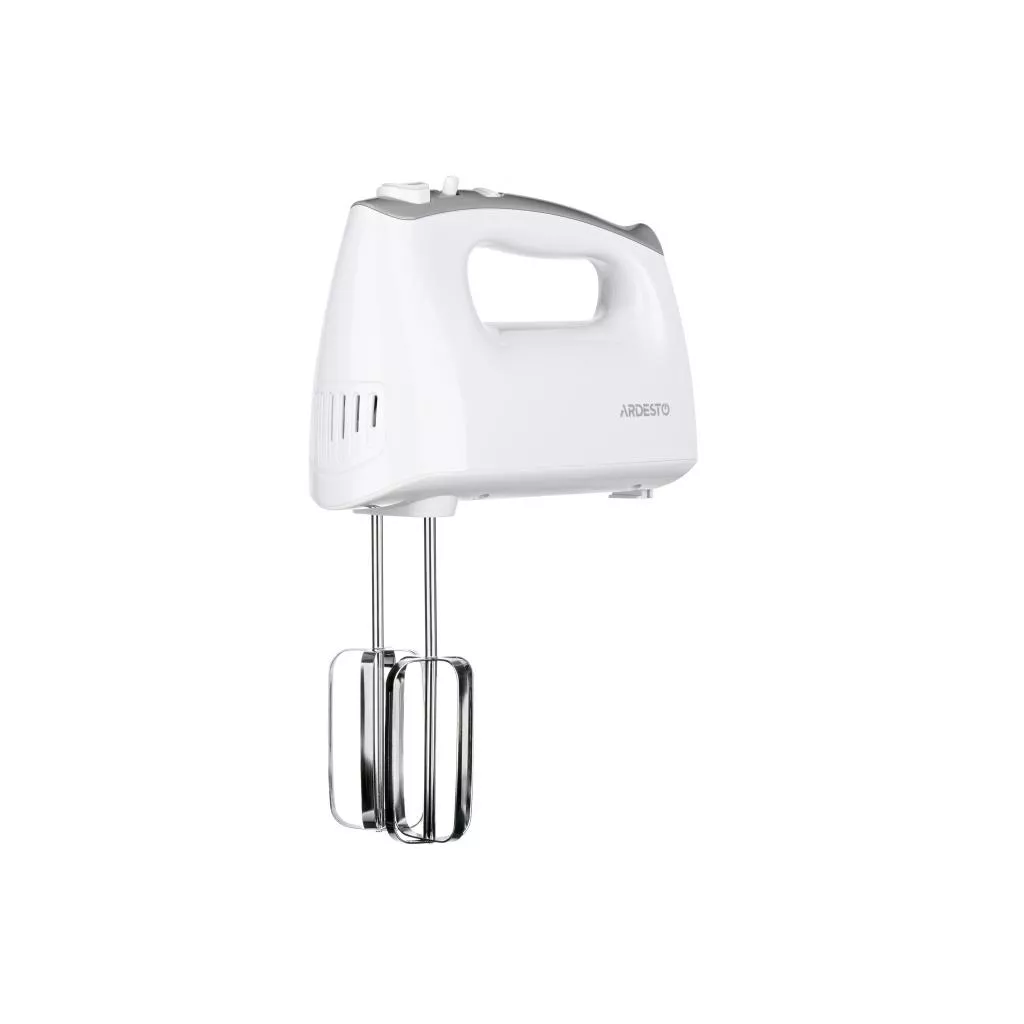 Миксер выполнен в эргономичном корпусе из прочного пластика белого цвета, а насадки — из прочной и надежной нержавеющей стали. Венчики предназначены для взбивания, а крючки для замешивания теста. Для удобного извлечения насадок есть клавиша. Для хранения насадок предусмотрен контейнер, который крепиться в нижней части устройства. Двигатель мощностью 400 Вт защищен от перегрева, предусмотрено пять режимов скорости, а также быстрый запуск режима Turbo.