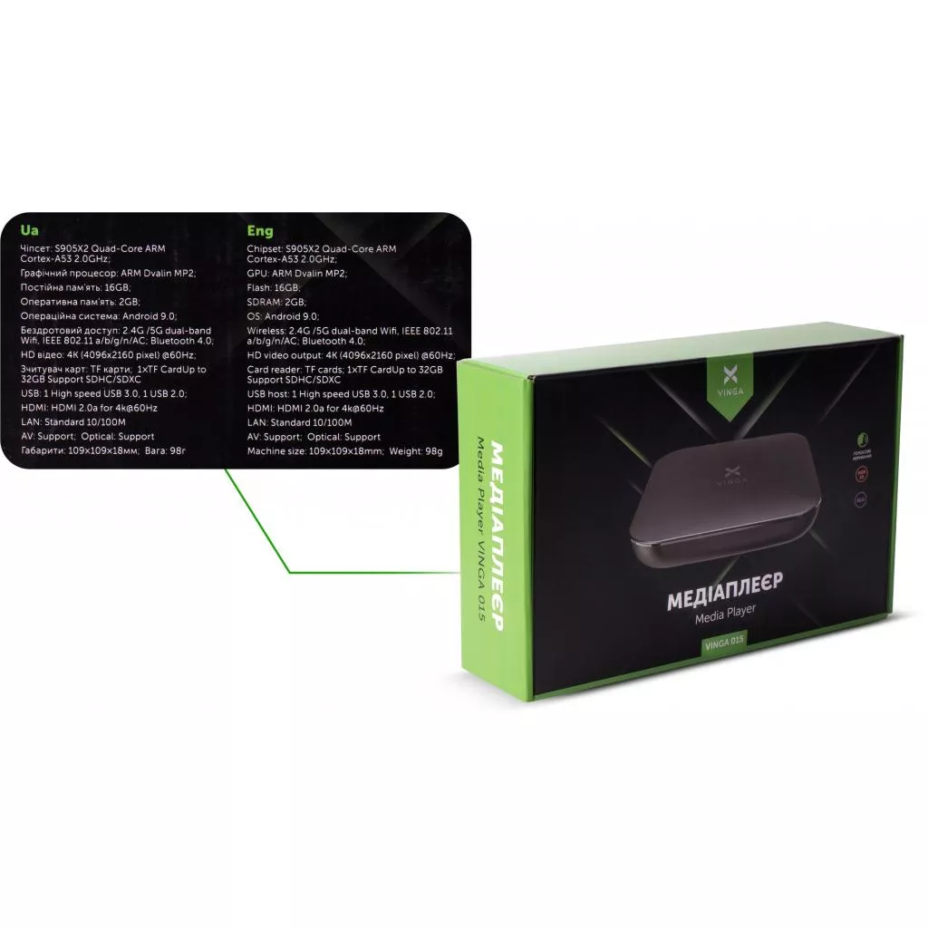 Медиаплеер Vinga 015 (VMP-015-162) призван расширить функциональные возможности телевизора без Smart TV. Приставка позволит воспроизводить телешоу, фильмы и спортивные матчи в разрешении Ultra HD 4K (4096 × 2160) прямо из интернета.
