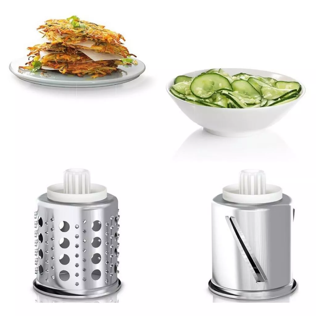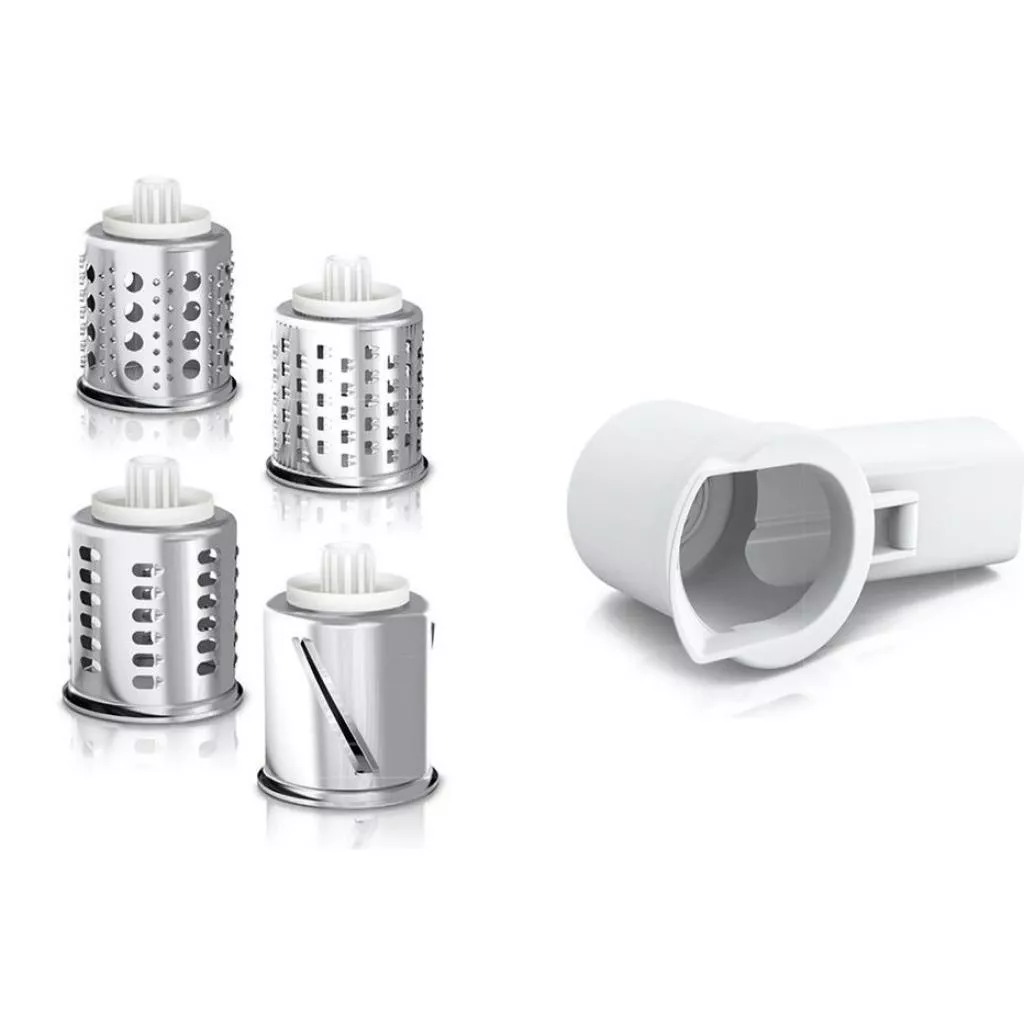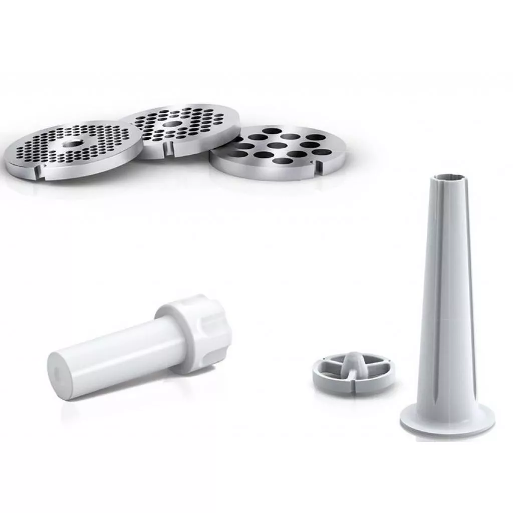 Бытовое устройство поставляется вместе со следующей комплектацией: диски для фаршировки 2,7 мм / 4 мм / 8 мм, насадки для создания колбас, кеббе и съёмные 4 барабаны для шинковки разными ломтиками.