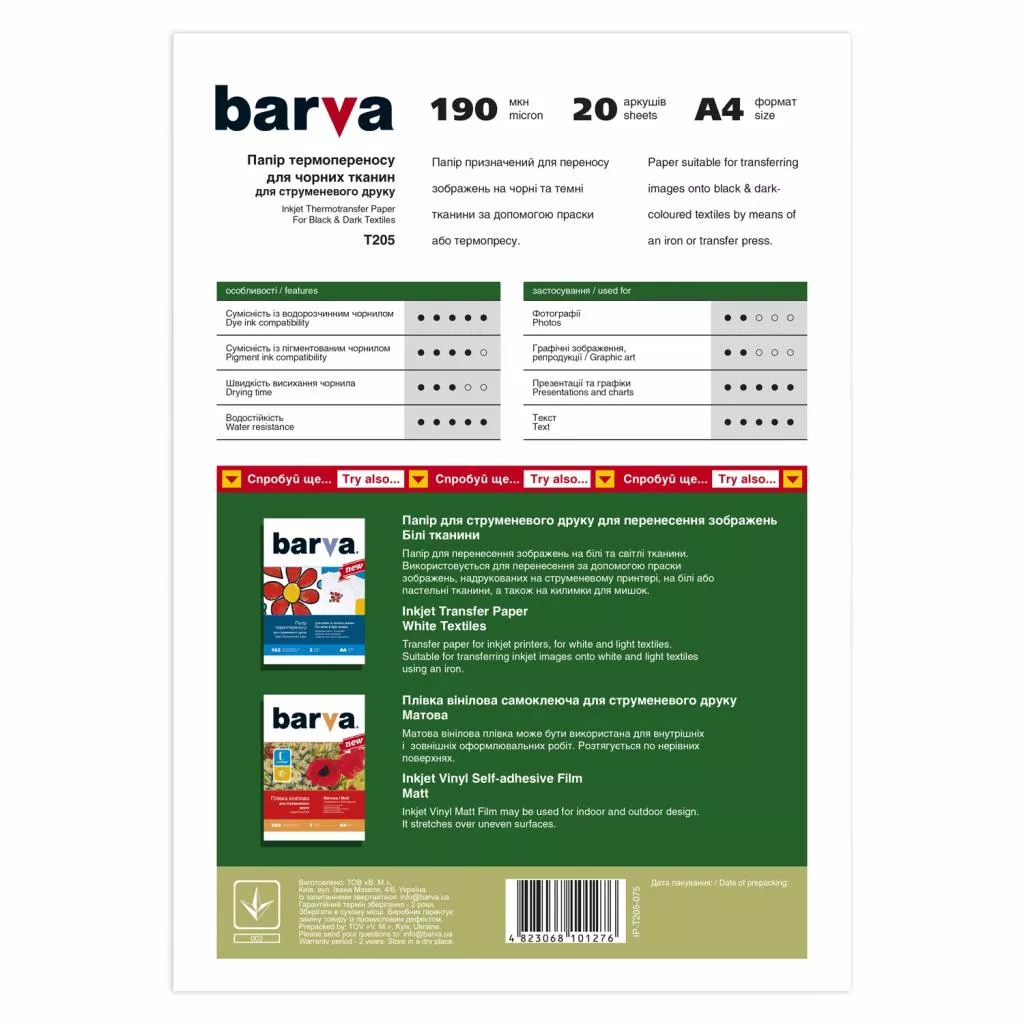 Приобрести Бумага BARVA A4 THERMOTRANSFER Black (IP-BAR-T205-075-1) Вы можете в компании "А-ТЕХНО", оформив заказ на этом сайте через корзину или позвонив по указанным телефонам.