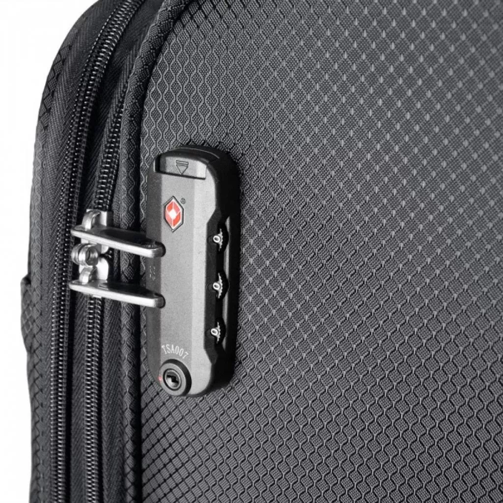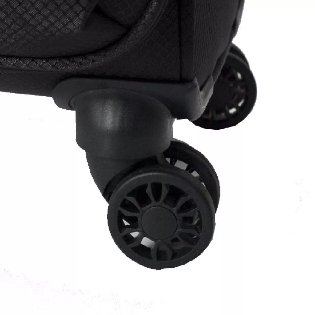 Чемодан оснащен четырьмя спаренными роликовыми колесами из высокотемпературного термопластичного полиуретана (TPU). Материал обладает прочностью сравнимой с пластиком, гибкостью силикона, а также имеет повышенную устойчивость к перепадам температур. Отличительной особенностью колес из TPU материала является снижение шума до минимума при качении чемодана по неровной поверхности. Благодаря устойчивости к истиранию материал колес отличается длительным сроком эксплуатации.