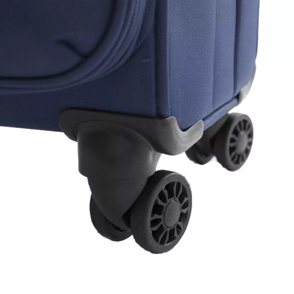 Чемодан оснащен четырьмя спаренными роликовыми колесами из высокотемпературного термопластичного полиуретана (TPU). Материал обладает прочностью сравнимой с пластиком, гибкостью силикона, а также имеет повышенную устойчивость к перепадам температур. Отличительной особенностью колес из TPU материала является снижение шума до минимума при качении чемодана по неровной поверхности. Благодаря устойчивости к истиранию материал колес отличается длительным сроком эксплуатации.