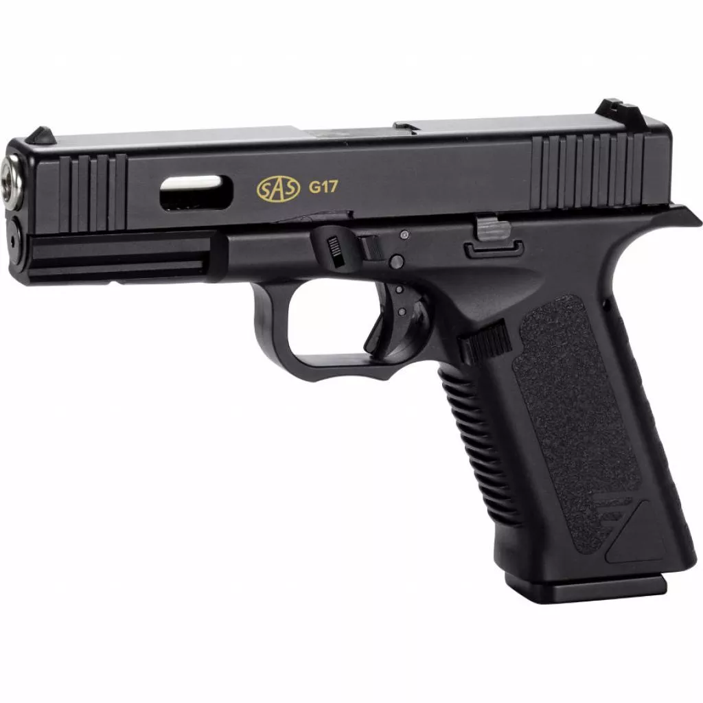 SAS G17 – пневматическая копия легендарного австрийского пистолета Glock 17. Рамка пистолета выполнена из прочного пластика, кожух затвора - металл. Ствол оснащен системой подкрутки шарика Pop-Up, что значительно увеличивает дальность и стабильность полета пули. SAS G17 комплектуется полноразмерным 15-зарядным магазином, что отличает данную модель от прочих пневматических аналогов.