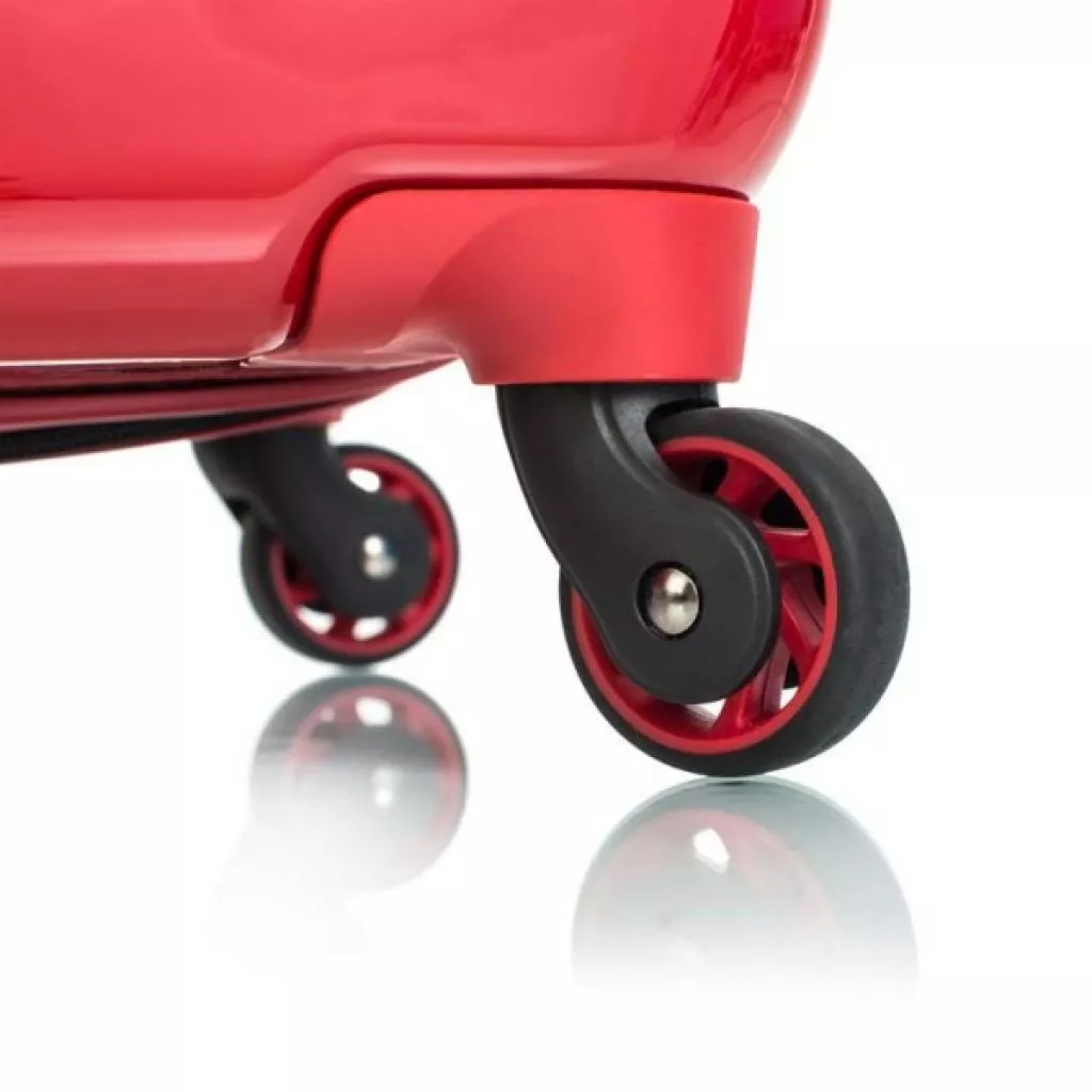 Чемодан оснащен четырьмя полноповоротными колесами, с возможностью независимого разворота каждого колеса на 360°. Системой предусмотрено равномерное перераспределения нагрузки на каждое колесо, что в свою очередь способствует плавному качению и маневренности чемодана, прилагая при этом минимум усилий. Также система позволяет быстро сменить колеса, без задействования сервисного центра.