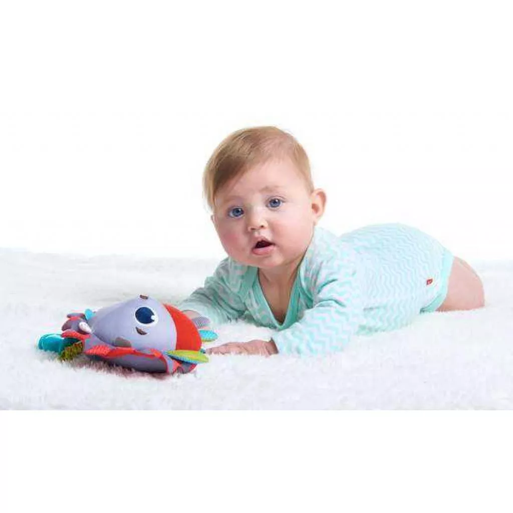 В лапках ежика малыш найдет грызунок-корзинку. На ней есть выпуклые точечки — он сможет их трогать пальчиками и даже жевать.