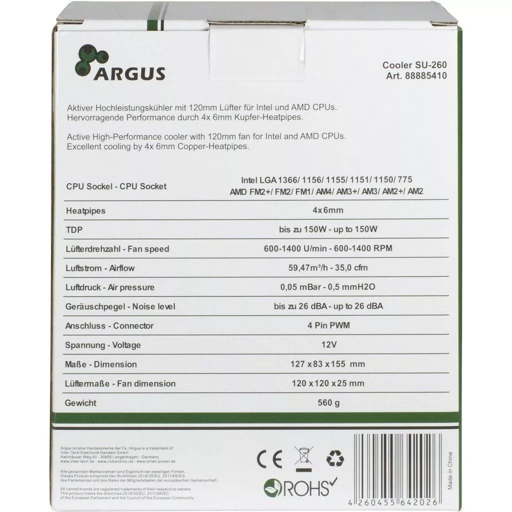 Система воздушного охлаждения немецкого бренда Argus предназначена для процессора. Уровень шума СО составляет 26 дБ. Комплектация: Система охлаждения, комплект крепежа, термопаста.