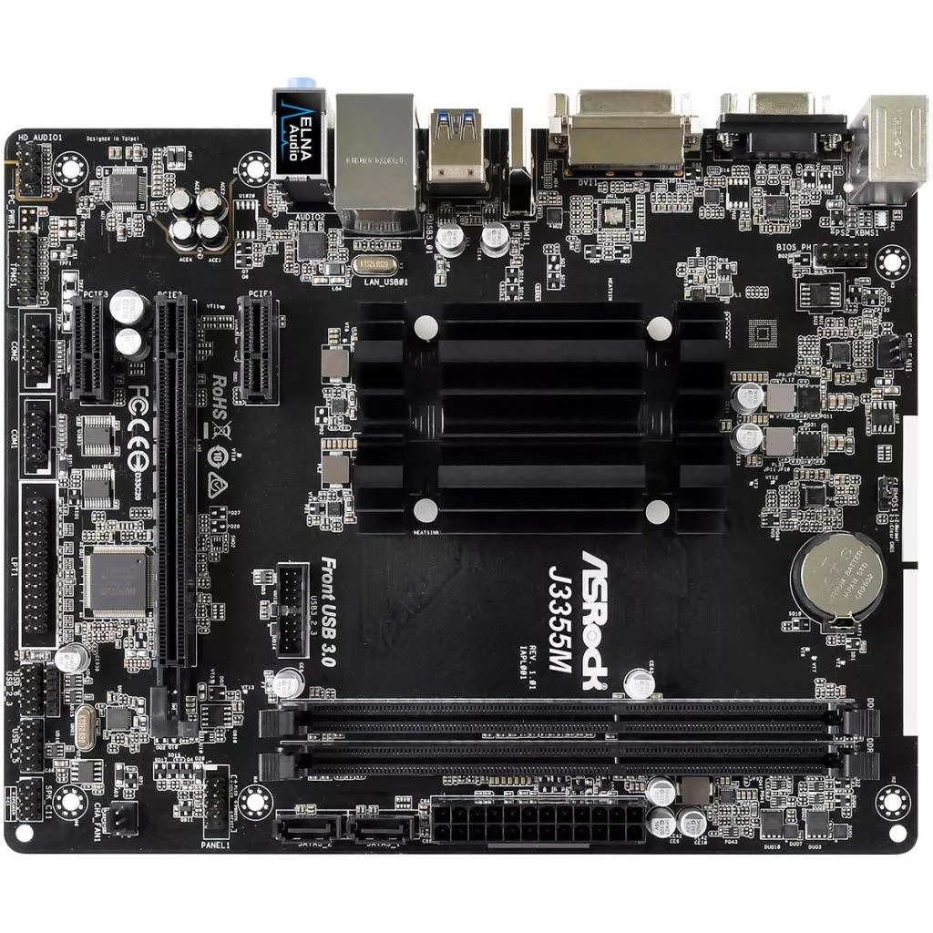 Материнская плата ASROCK J3355M mATX поставляется с интегрированным 2-ядерным процессором Intel Celeron J3355 тактовой частотой 2 ГГц. Встроенная графическая подсистема Intel HD Graphics 500 обеспечивает корректный видеопоток на выходах VGA, DVI и HDMI. Оперативная память представлена блоком из пары ячеек DIMM DDR3/L тактовой частотой 1866 МГц. Обмен данными с ЦПУ ведется по одному каналу. Материнская плата ASROCK J3355M mATX оборудована двумя 16-канальными разъемами PCI-E 2.0 для подключения видеокарт. Для других расширений оставлено два слота PCI-E x1. Жесткие диски подключаются через три SATA III интерфейса. Для подключения периферических устройств выделено 4 USB-порта и два разъема PS/2. Обработкой звуков занимается интегрированная карта Realtek ALC887 с поддержкой аудио 7.1.