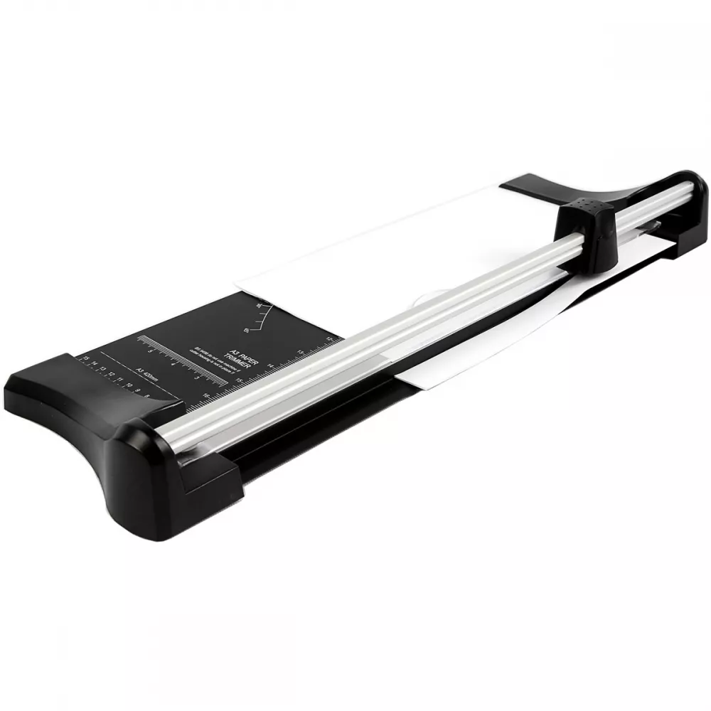 Резак Agent TR 440. Тип резака - роликовый (дисковый). Формат А3 (ширина реза 440 мм). Толщина стопы 1 мм (10 листов), прижим автоматический. Контрлезвие есть. Размер стола 440х150 мм. Вес 1, 25 кг.