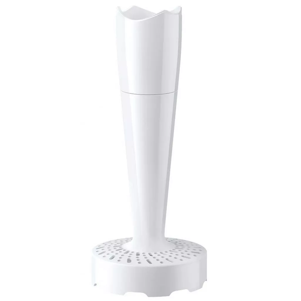 Блендер имеет основной элемент — мощную металлическую ножку из нержавеющей стали. Форма насадки имеет особую форму в виде колокола, что препятствует разбрызгиванию смесей. Ножи насадки так же изготовлены из прочной нержавеющей стали.