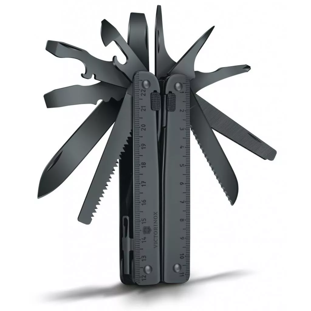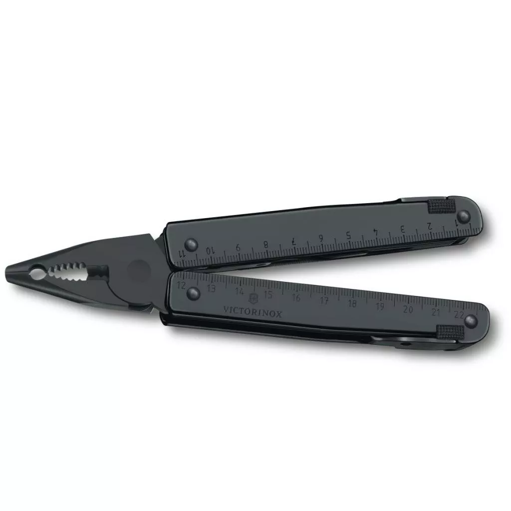 SwissTool на первый взгляд - это пассатижи с ручками-линейками. Но ручки – это ножны для большого количества инструментов: большого лезвия, открывалок, пилы по дереву, напильника, ножовки по металлу, отверток и многого другого.