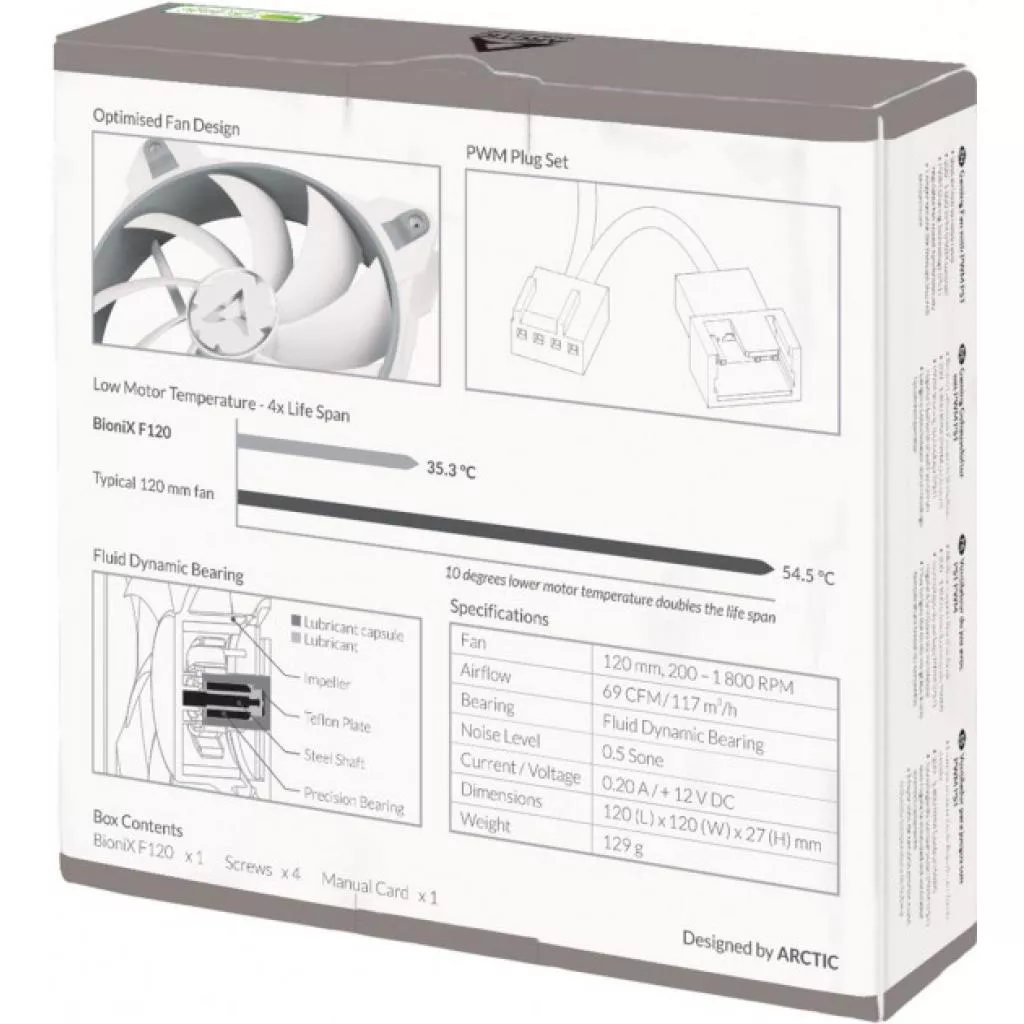 Чрезвычайно тихая работа благодаря недавно разработанному двигателю гарантирует длительные сеансы без раздражающего шума. Новый двигатель вентиляторов BioniX устраняет вибрации непосредственно у его источника, в частности у двигателя. Двигатель ARCTIC поглощает 95% вибраций по сравнению с обычным двигателем постоянного тока. Таким образом, нет необходимости в резиновых прокладках благодаря постоянному крутящему моменту и более плавному переключению магнитного поля.