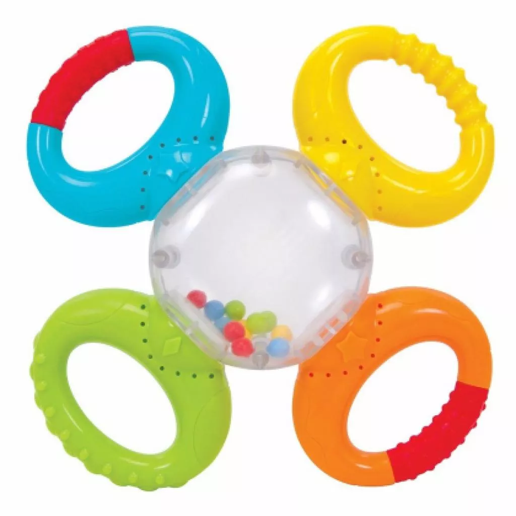 Погремушка состоит из разноцветных колечек с ребристыми ручками, которые крепятся на прозрачную деталь с разноцветными шариками. Ручки могут поворачиваться вокруг своей оси, издавая при этом характерный звук, привлекая внимание малыша. Ручки с ребристой поверхностью облегчают захват игрушки детской ручкой, препятствуют скольжению и способствует развитию мелкой моторики.
