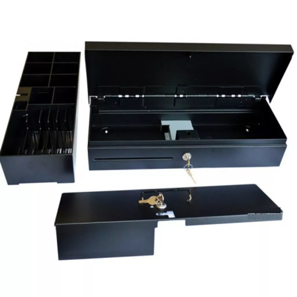 Денежный ящик FТ4617 изготовлен из стали, имеет переносимую пластиковую кассетницу с собственной крышкой и замком. Кассетница имеет 8 отделений для монет и 6 для купюр, отделение для чеков (кредитных карт и т.д.) и выполнена из пластика ABS. Конструкция отделений для купюр позволяет менять их ширину в зависимости от текущего количества, что позволяет размещать банкноты одного номинала вместе. На передней панели выдвижной части располагается прорезь для вброса купюр и документов. Применение качественных материалов и механизмов обеспечит долгий срок службы. FТ4617 имеет место для скрытого хранения документов или купюр больших номиналов. Предусмотрен замок на три положения ключа - закрыто, открытие по команде от интерфейса RJ12 (фискальный регистратор, принтер, касса), открытие вручную. Вертикальное открытие крышки более удобно при работе с постоянным потоком покупателей, а стандартные габариты и дизайн позволяют использовать ящик FТ4617 в действующих магазинах, не изменяя организации рабочего места кассиров. Возможна покупка дополнительных закрываемых крышками кассетниц для повышения эффективности работы магазина.