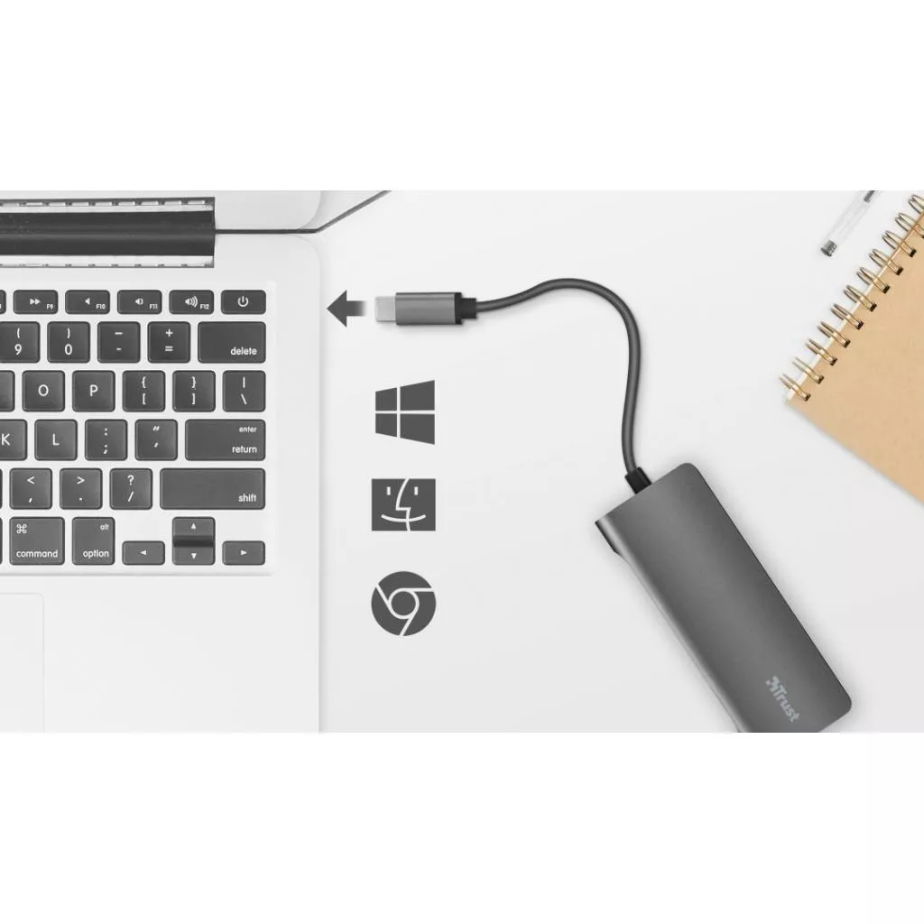 Стильный алюминиевый многопортовый адаптер USB-C добавляет ноутбуку порты HDMI, USB-C, USB-A, считыватель карт памяти и сетевой порт, а для подключения использует один порт USB-C.