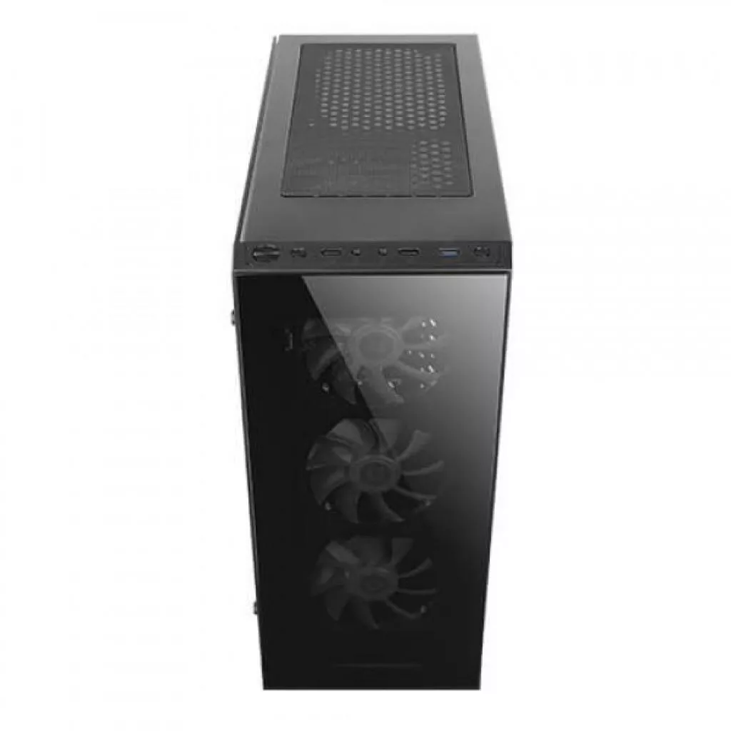Дизайн устройства выполнен в черном цвете, особенностью данной модели выступает стеклянное боковое окно, которое позволяет наблюдать за работой внутренних компонентов. Такие характеристики придают уникального внешнего вида, который станет украшением любого рабочего места. На верхней панели размещены все необходимые порты, которые упрощают процесс подключения периферийных устройств.