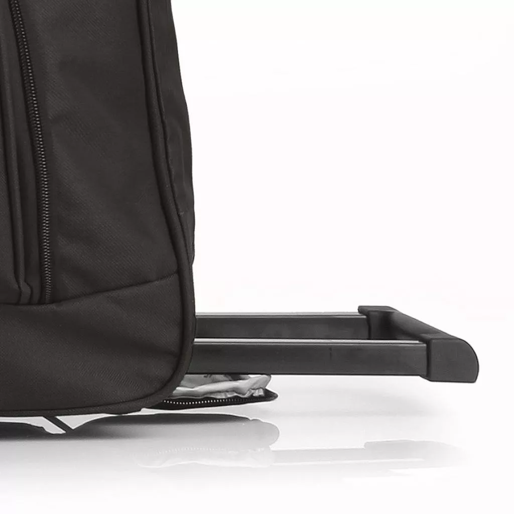 Сумка оснащена парой надежных роликовых колес. Колеса изготовлены из высокотемпературного термопластичного полиуретана (TPU). Материал обладает прочностью сравнимой с пластиком, гибкостью силикона, а также имеет повышенную устойчивость к перепадам температур. Отличительной особенностью колес из TPU материала является снижение шума до минимума при качении чемодана по неровной поверхности. Благодаря устойчивости к истиранию материал колес отличается длительным сроком эксплуатации.
