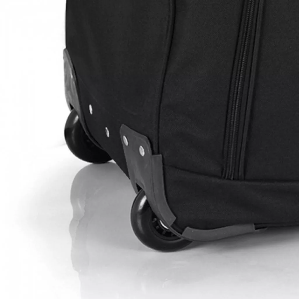 Сумка оснащена парой надежных роликовых колес. Колеса изготовлены из высокотемпературного термопластичного полиуретана (TPU). Материал обладает прочностью сравнимой с пластиком, гибкостью силикона, а также имеет повышенную устойчивость к перепадам температур. Отличительной особенностью колес из TPU материала является снижение шума до минимума при качении чемодана по неровной поверхности. Благодаря устойчивости к истиранию материал колес отличается длительным сроком эксплуатации.