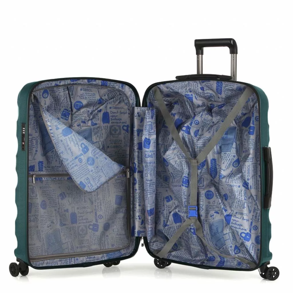 Чемоданы премиальной коллекции Air от Gabol выполнены из высокотехнологичного комбинированного материала - Polycarbonate / Aluminium fiber. Этот легкий, эластичный и в то же время прочный материал. Благодаря своим свойствам, материал устойчив к деформациям (после деформации принимает прежнюю форму), не растрескивается на морозе, и практически без видимых повреждений переносит удары и механические воздействия, что очень важно для чемоданов, перевозимых в багажных отделениях. Внутренний объем чемодана имеет ремни для фиксации вещей, а так же дополнительные карманы на молниях для мелких аксессуаров.