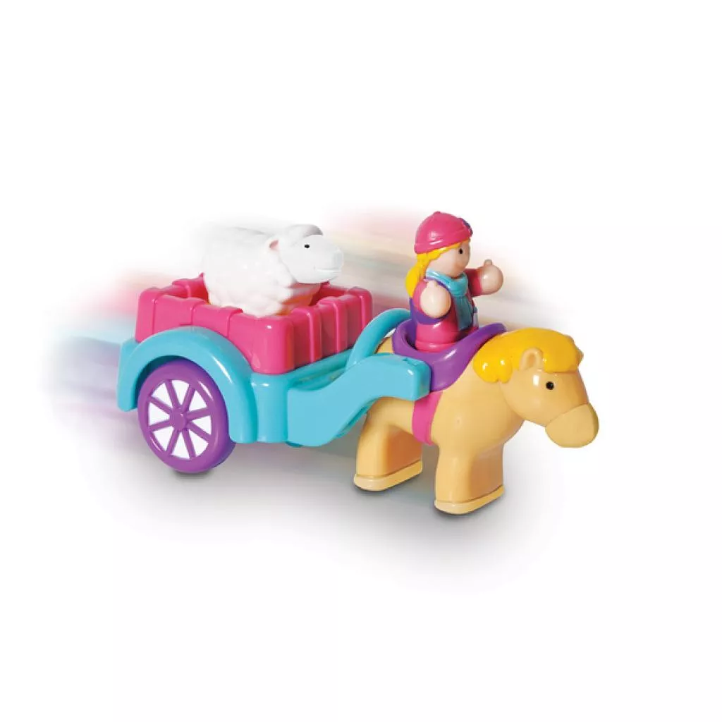 Поместите ягненка в тележку, прикрепите лошадь и подтолкните ее, чтобы она начала движение, которое будет сопровождаться реалистичным звуком цоканья копыт!