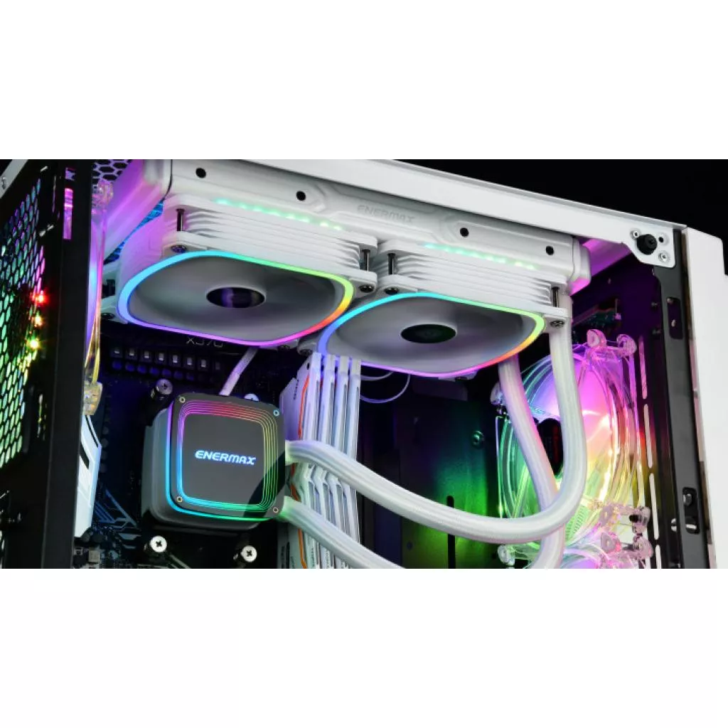 Aquafusion представляет собой универсальную систему жидкостного охлаждения процессора с индивидуально адресуемыми светодиодами RGB. Водяной блок RGB оснащен 3D Layer Design с Aurabelt для уникальных световых эффектов. Вместе с вентиляторами ENERMAX SquA RGB Aquafusion может создавать динамические визуальные ощущения с помощью программного обеспечения материнской платы или прилагаемого блока управления. Вентиляторы ENERMAX SquA RGB создают сильное центрированное давление воздуха через рамную конструкцию Vortex для быстрого отвода тепла от радиатора. С запатентованной конструкцией Shunt-Channel-Technology (SCT) холодная пластина может увеличить импульс потока охлаждающей жидкости и ускорить теплопередачу. Aquafusion — это уникальное решение для охлаждения пользовательских игровых платформ или потрясающих сборок систем для процессоров Intel и AMD.