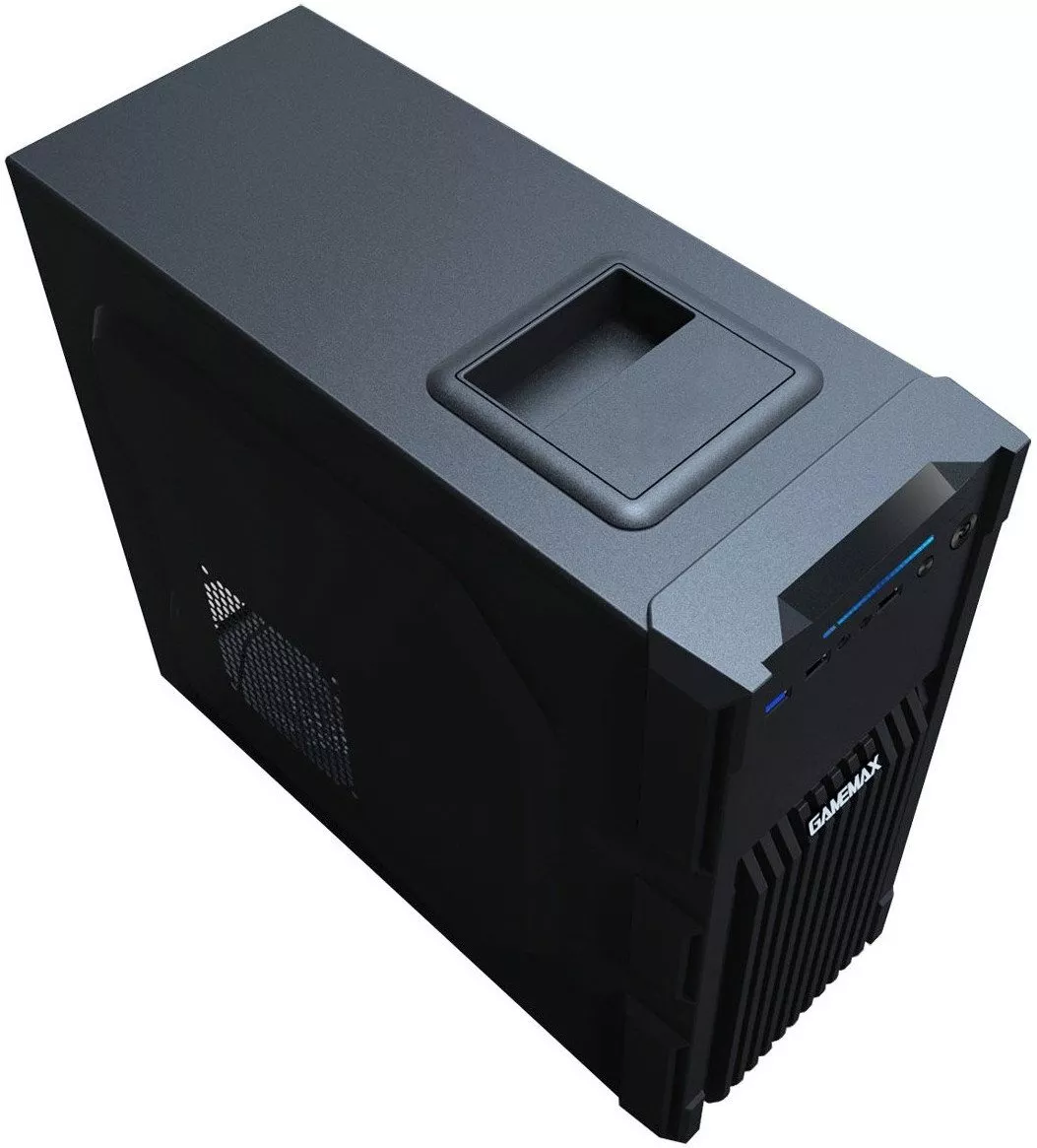 GameMax GM-One — современный корпус формата ATX/mATX и типоразмера: Miditower имеет синюю подсветку вентиляторов.