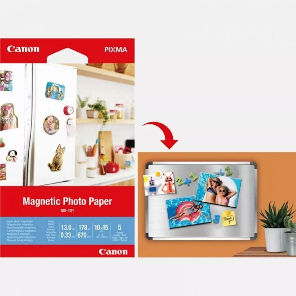 Canon MG-101 — магнитная фотобумага. С помощью магнитной фотобумаги вы можете создавать креативные магниты. Напечатанные снимки могут, например, быть размещены на дверце холодильника или отданы в качестве индивидуальных сувениров.