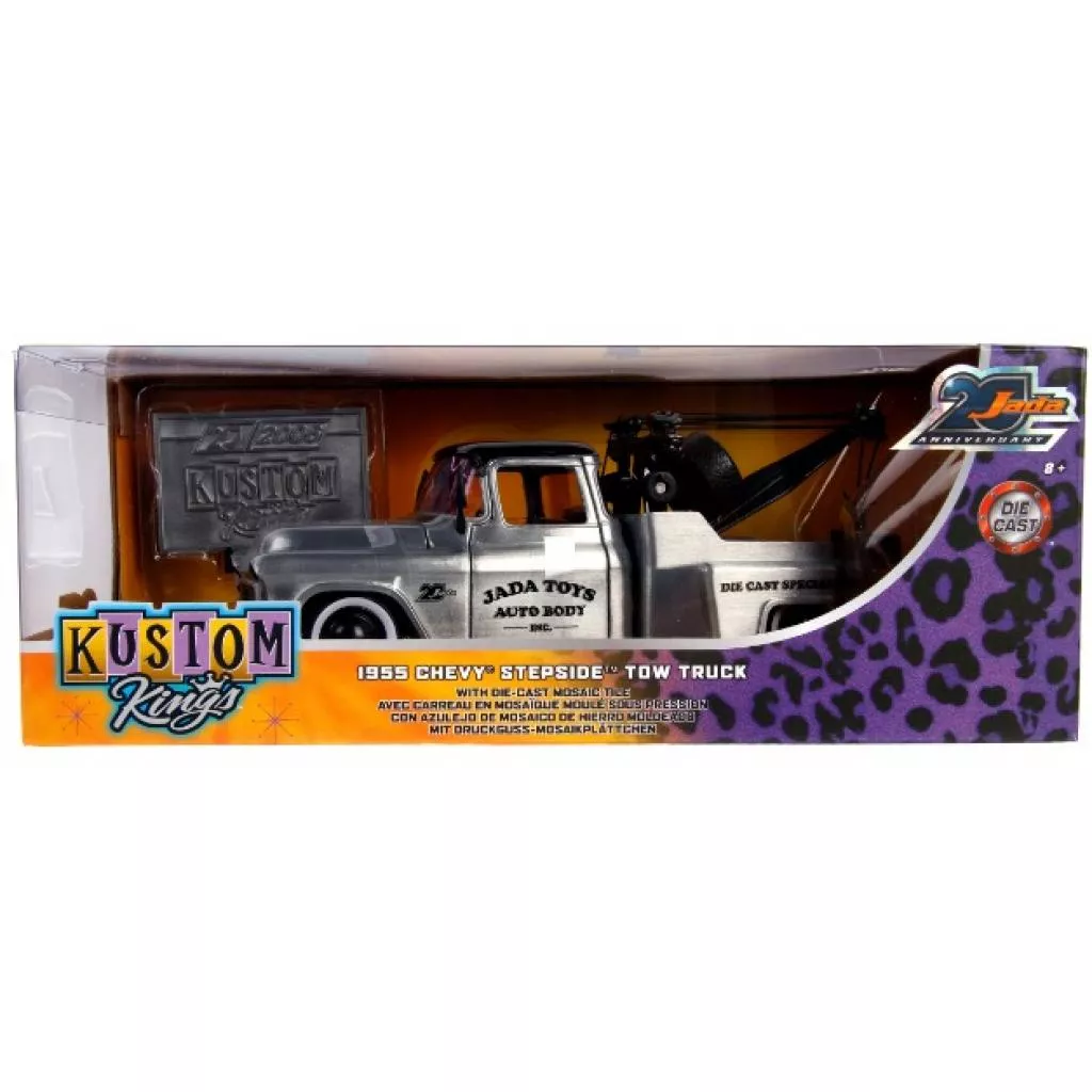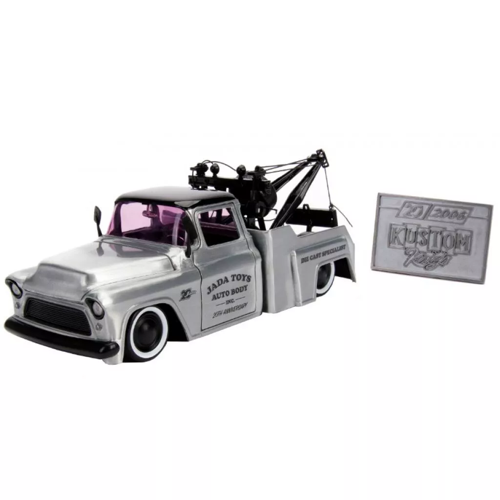 Компанией Jada представлен лицензионный эвакуатор "1955 Шевроле Степсайд", ни один мальчик или заядлый коллекционер не останутся равнодушными. Литой металлический корпус повторяет до мелочей дизайн реального автомобиля: прозрачное лобовое стекло, боковые зеркала заднего вида, эвакуационный механизм, широкие диски на колесах, низкая подвеска. А распашные детали: капот и двери позволят рассмотреть салон и двигатель автомобиля.