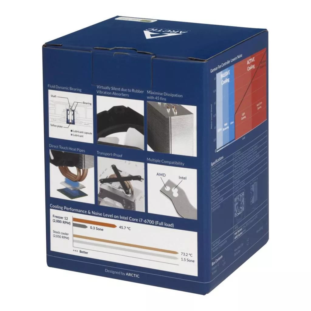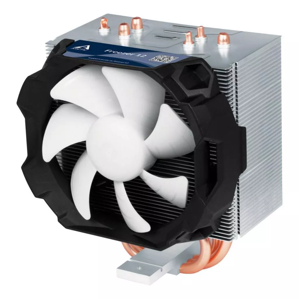 Кулер для процессора Arctic Cooling Freezer 12 (ACFRE00027A) — это кулер для процессора, имеет 3 U-образные медные тепловые трубки. Максимальная мощность охлаждения кулера составляет 150 Вт. Имеет функцию PWM для автоматического управления скоростью вращения вентилятора по мере нагрузки на процессор. 92-мм вентилятор остается практически бесшумным даже при максимальной скорости вращения.