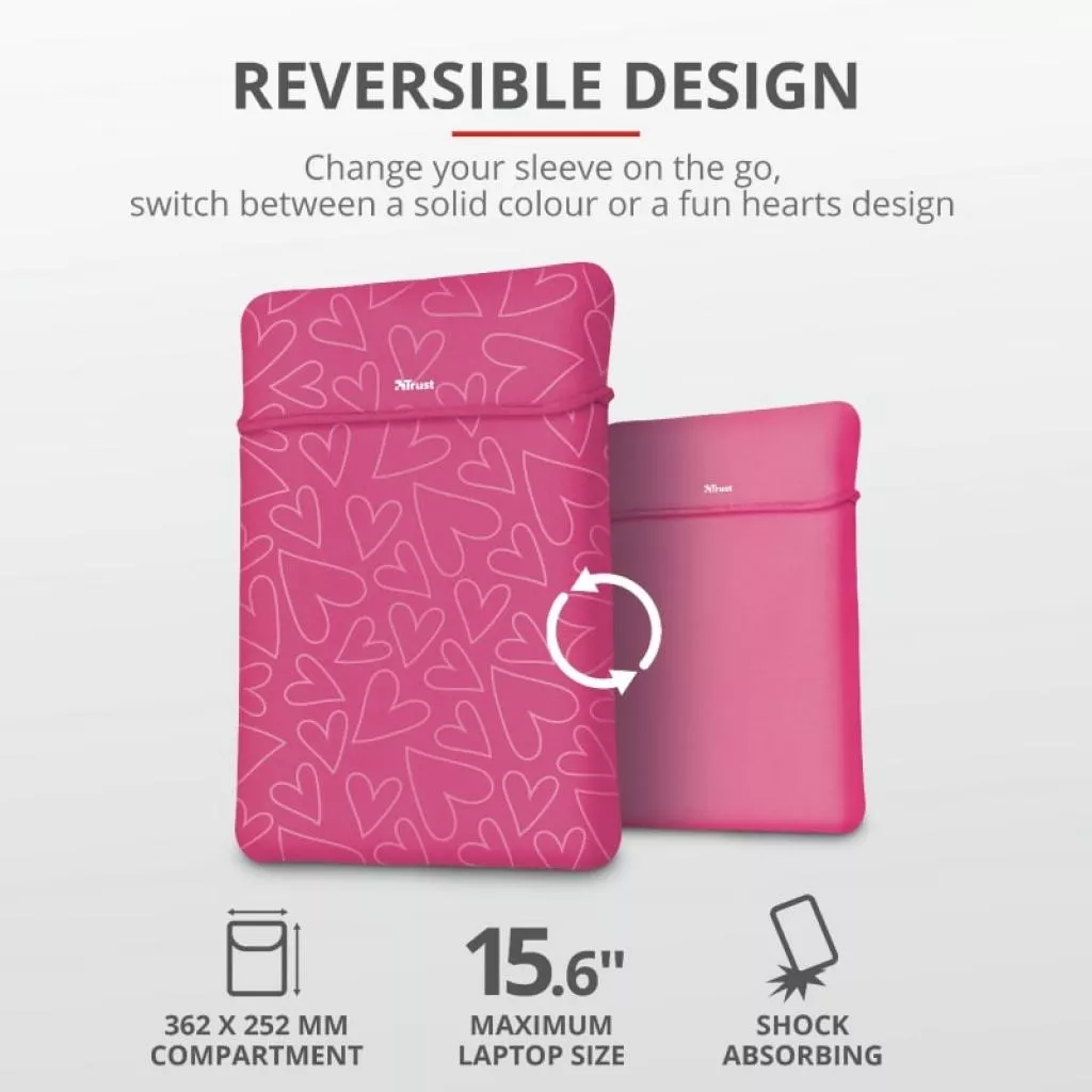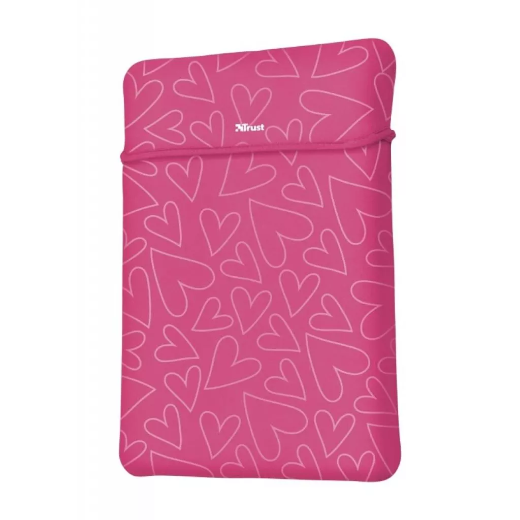 Главная особенность чехла - он двусторонний. Пользователь может использовать любую сторону чехла, подстраивая его под свое настроение. С одной стороны изделие черное с принтом в виде сердец, а с другой - классический черный. На корпусе аксессуара нет молний, поэтому ноутбук достаточно легко и удобно доставать без лишних усилий.
