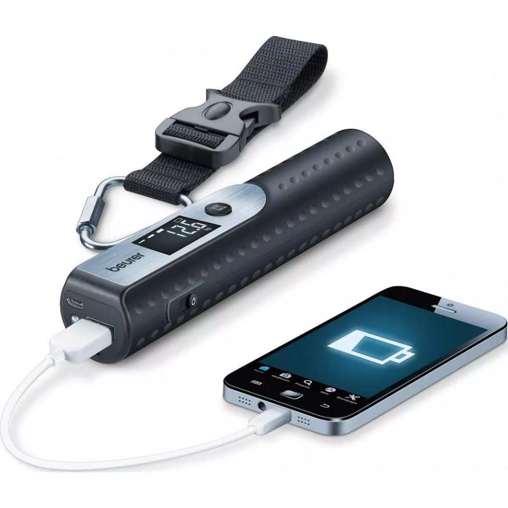 Идеальный вариант для использования в дороге. Чрезвычайно простой процесс взвешивания. В комплект входят внешний аккумулятор, багажные весы и фонарик. С кабелем Micro-USB для зарядки внешнего аккумулятора. Внешний аккумулятор совместим с устройствами с портом USB (смартфоны, MP3-плееры и пр.). Емкость аккумулятора 5000 мАч.