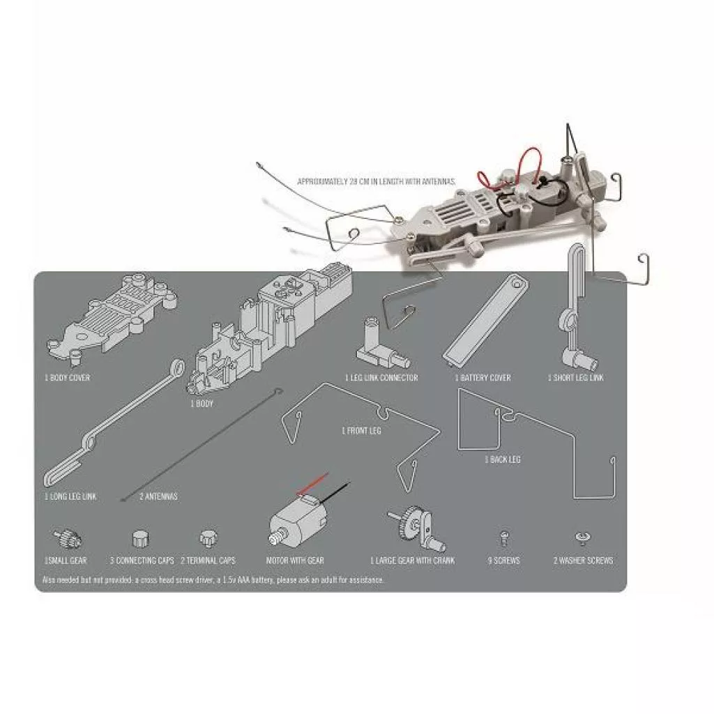 Собрать этого робота-насекомого совсем не сложно. Он демонстрирует механизмы роботизированного движения: ползет, извивается и ходит. Набор имеет награды специализированных выставок.Модель работает при помощи мотора с батарейкой и системы кривошипно-шатунных механизмов. Один из них расположен в соединении большой оси с кривошипом и длинным соединительным звеном. Кривошип превращает круговое движение мотора в повторяющееся возвратно-поступательное движение вверх-вниз и вперед-назад. Способ, при помощи которого длинное соединительное звено тянет и толкает короткое, также является примером кривошипно-шатунного механизма. Благодаря этим механизмам ноги робота могут вращаться, а винты выполняют роль точки вращения. Робот-инсектоид может выполнять разные трюки. К набору прилагается буклет с интересными научно-познавательными фактами.Рейтинг страницы: 4.6