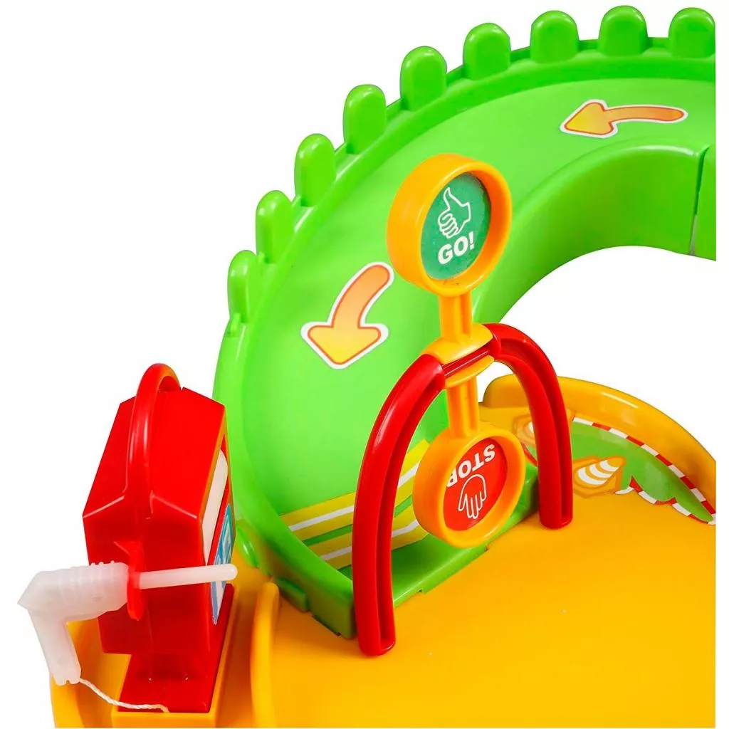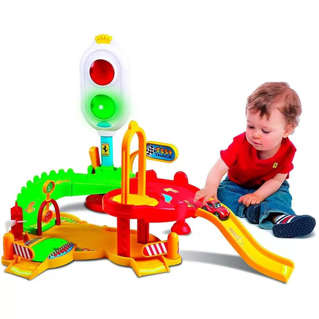 Собираются 2 горки со светофором, есть лифт для машинки (она в комплекте). При нажатии кнопки светится светофор и слышен звук двигателя. Лицензия Ferrari.