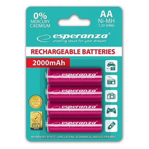 Аккумуляторы Esperanza сочетают новейшие технологии, современные никель-металлогидридные аккумуляторы с преимуществами традиционных щелочных батарей и отлично их заменяют. Одновременно влияют на меньшее загрязнение окружающей среды и позволяют добиться значительной экономии финансовых средств. Аккумуляторы Esperanza после года, сохраняют 85% своей номинальной емкости.