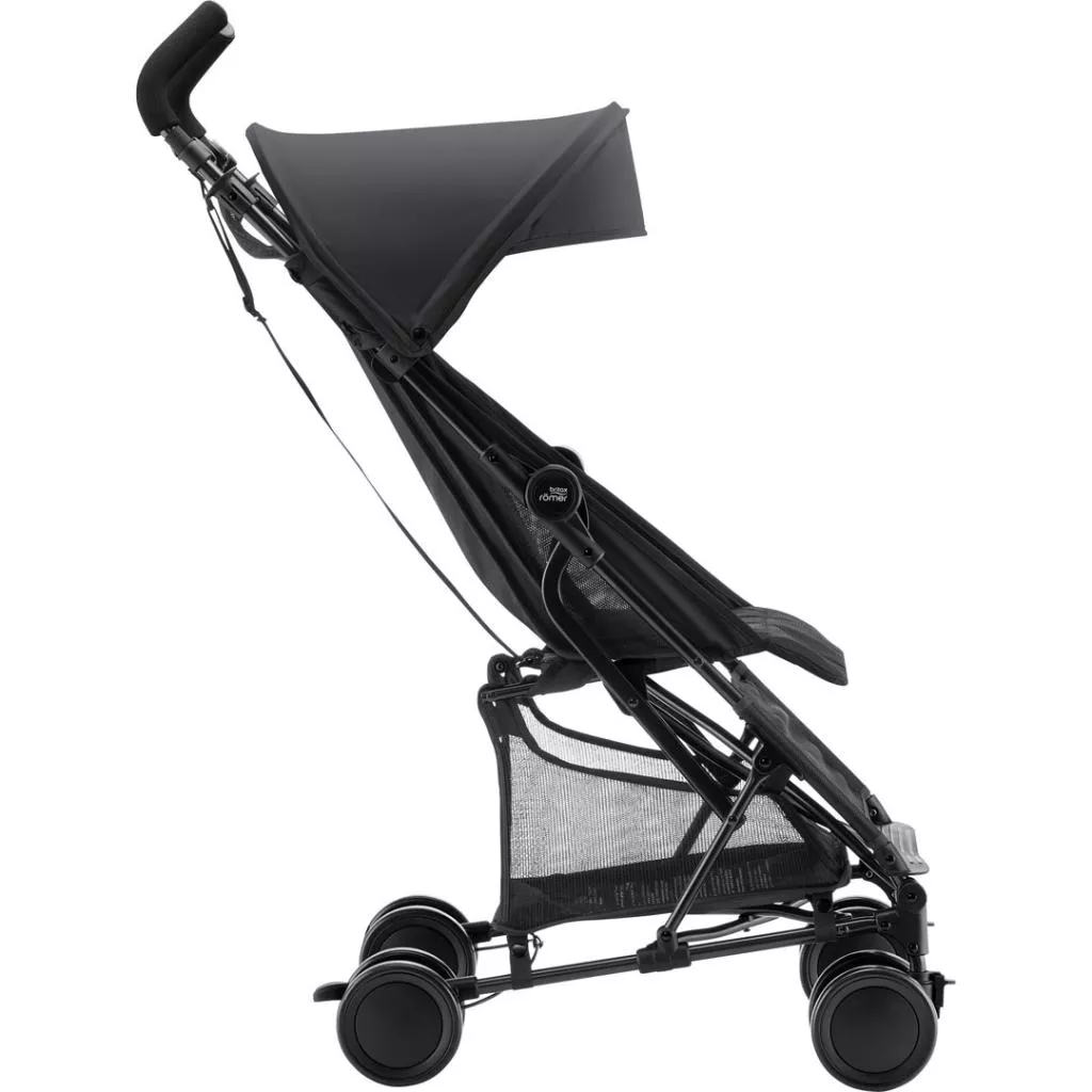 Коляска Britax-Romer Holiday² чрезвычайно быстро складывается и имеет компактные размеры в сложенном виде. Также она оснащена системой автоматической фиксации в сложенном положении. Коляска достаточно мала, что поможет ей поместиться в багажнике любого автомобиля. Очень удобно, что в сложенном виде она опирается на свои колеса, благодаря чему тканевые элементы не соприкасаются с землей и дольше остаются чистыми.