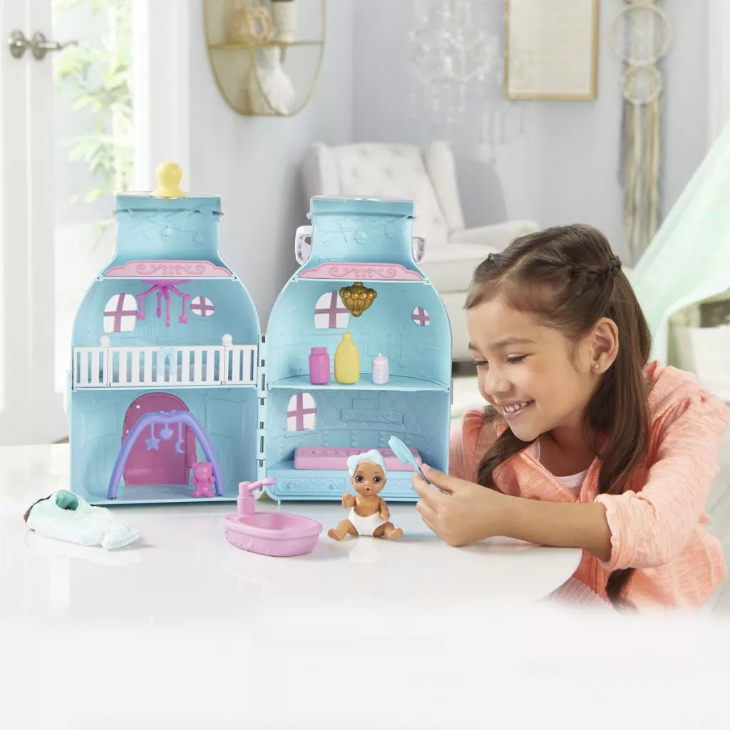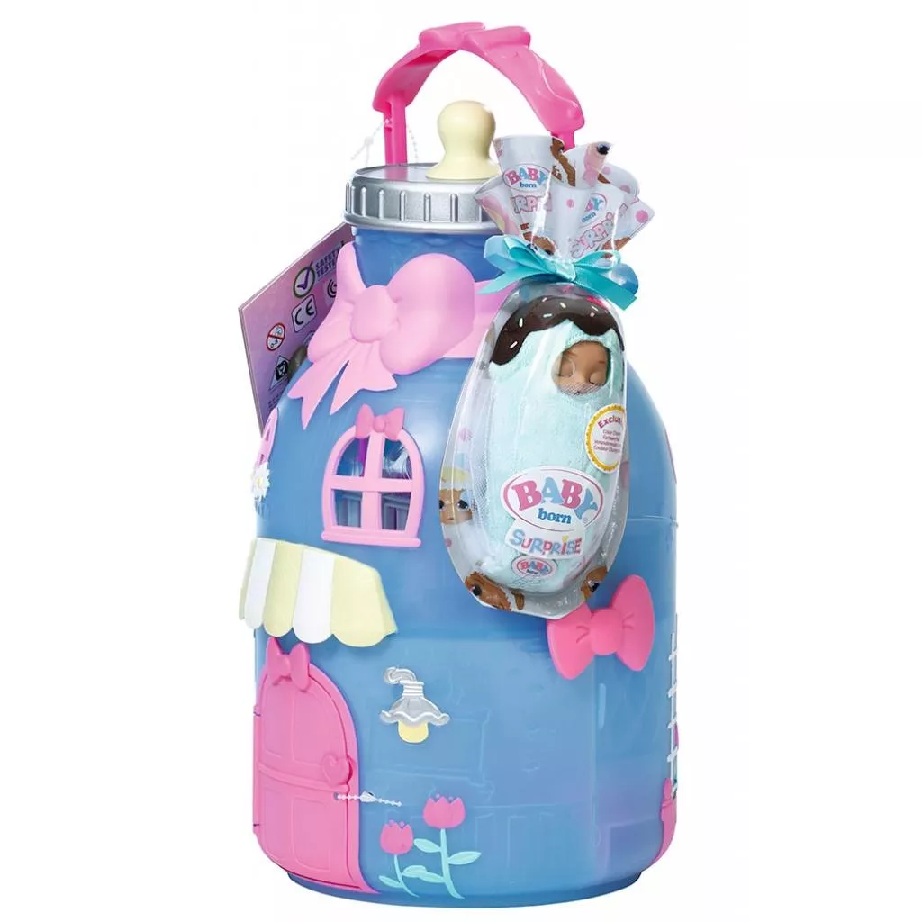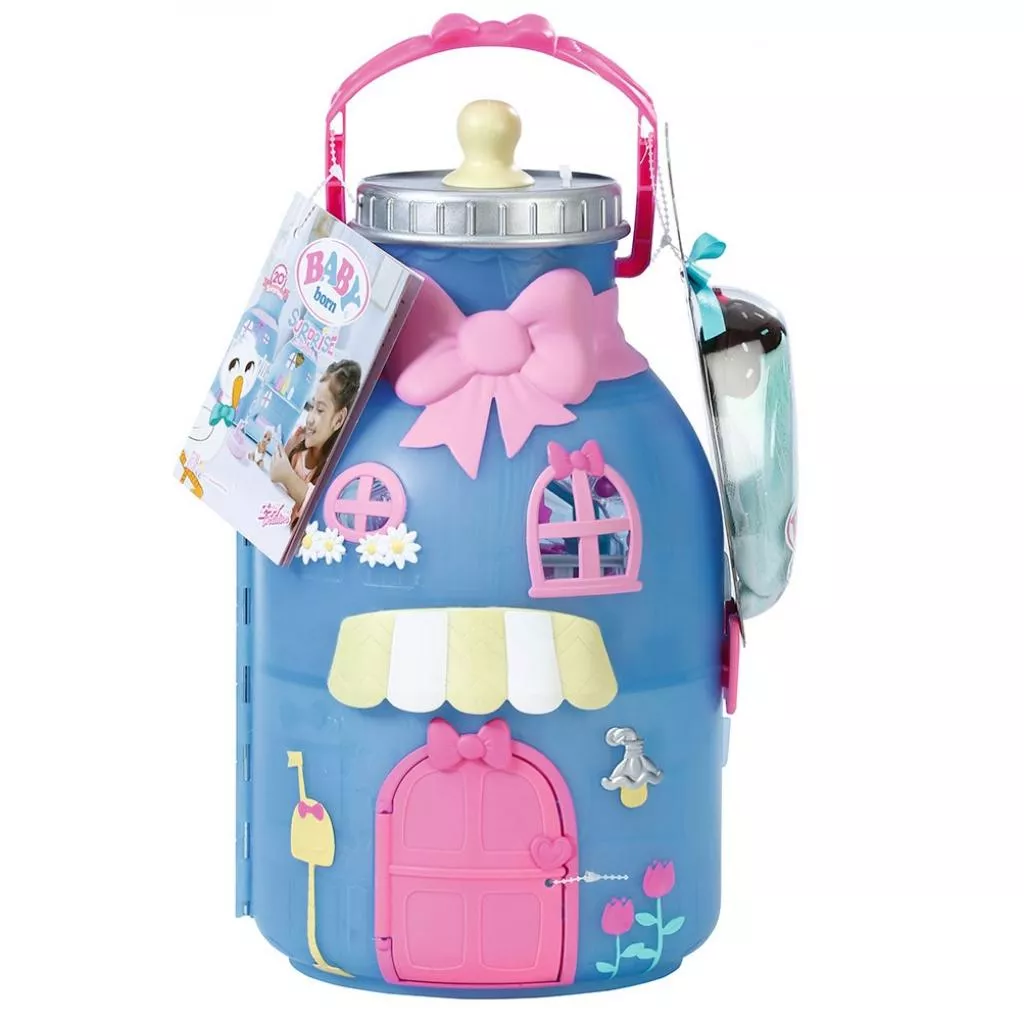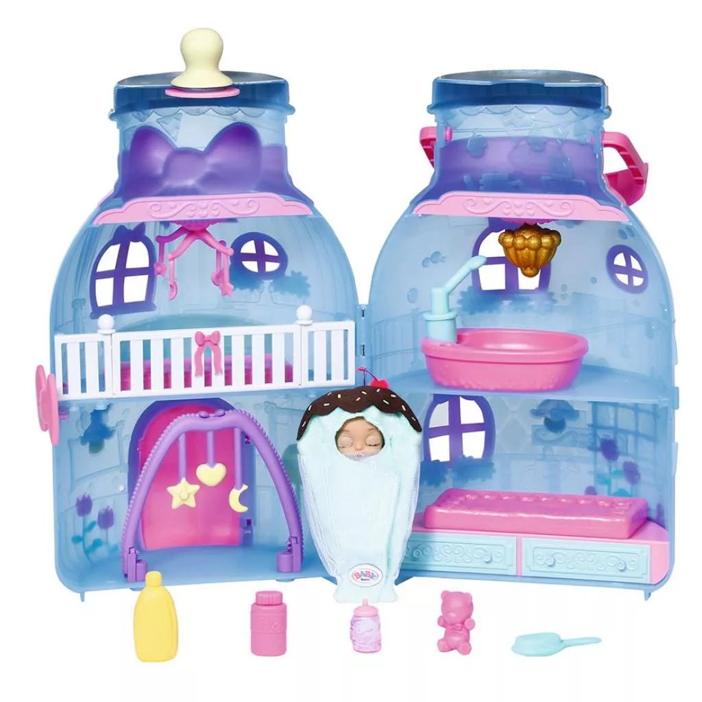 Это же домик малышки в виде волшебной бутылочки от BABY born! Откройте, чтобы увидеть двухэтажный домик, милого жителя и еще множество аксессуаров! 20 сюрпризов, которые спрятаны внутри. На первом этаже находится игровая комната с детским спортзалом и мишкой. А рядом — пеленальный столик с бутылочкой и щеткой.