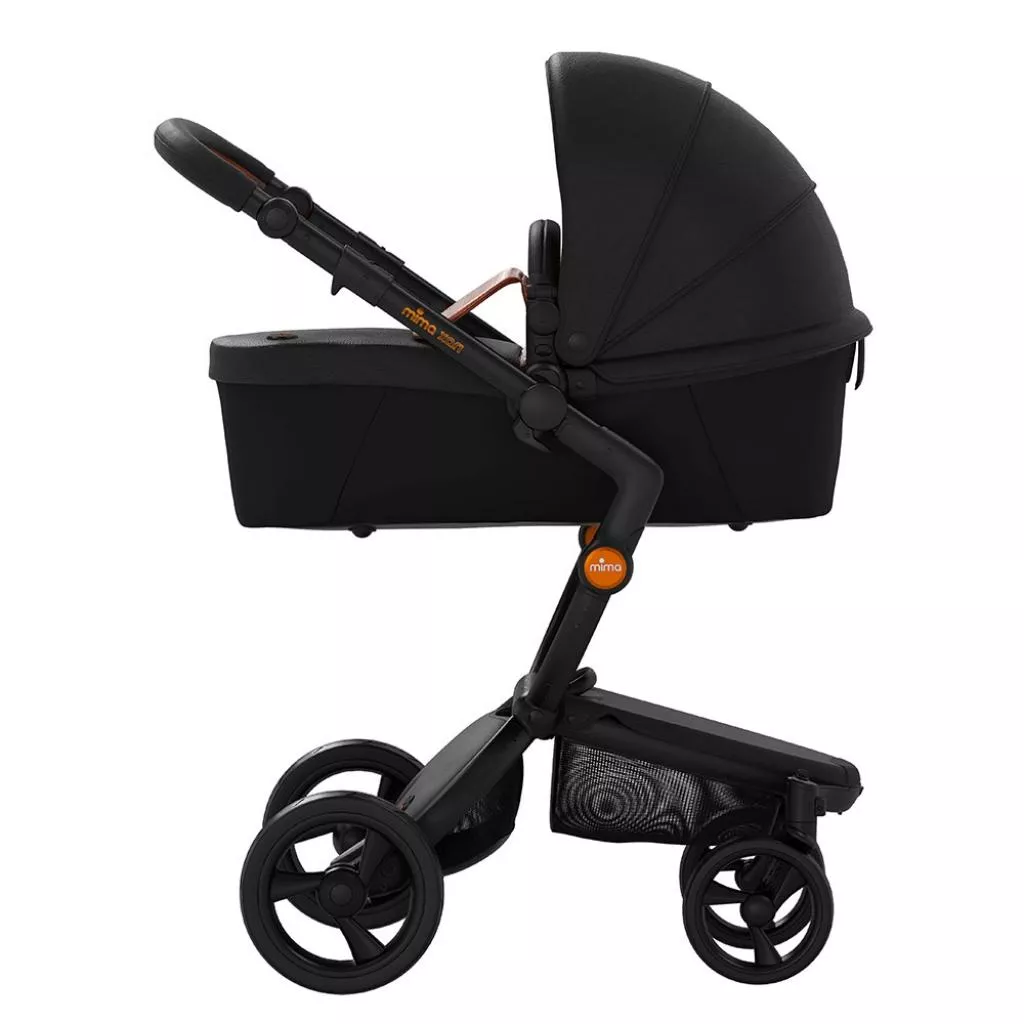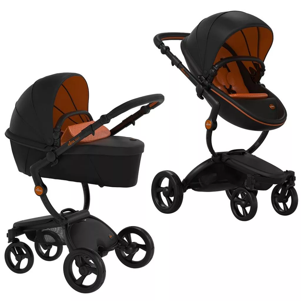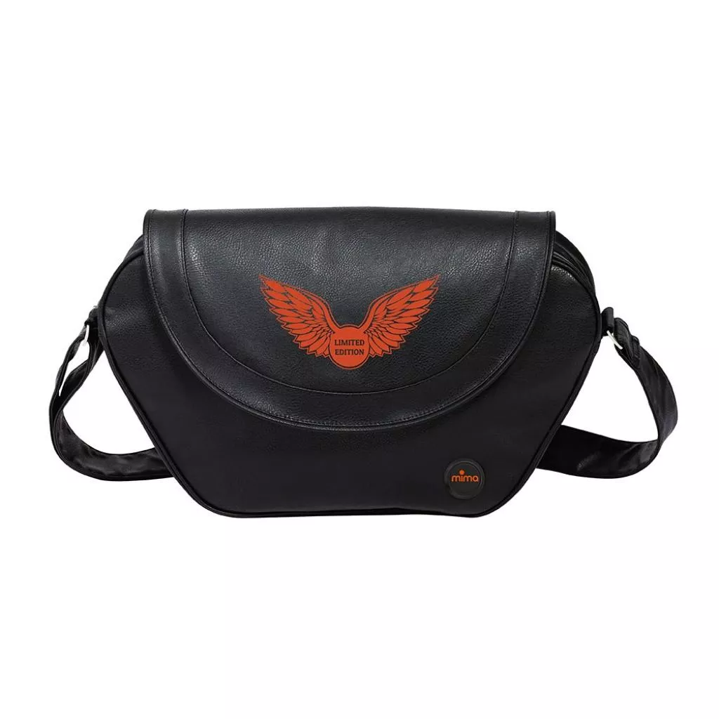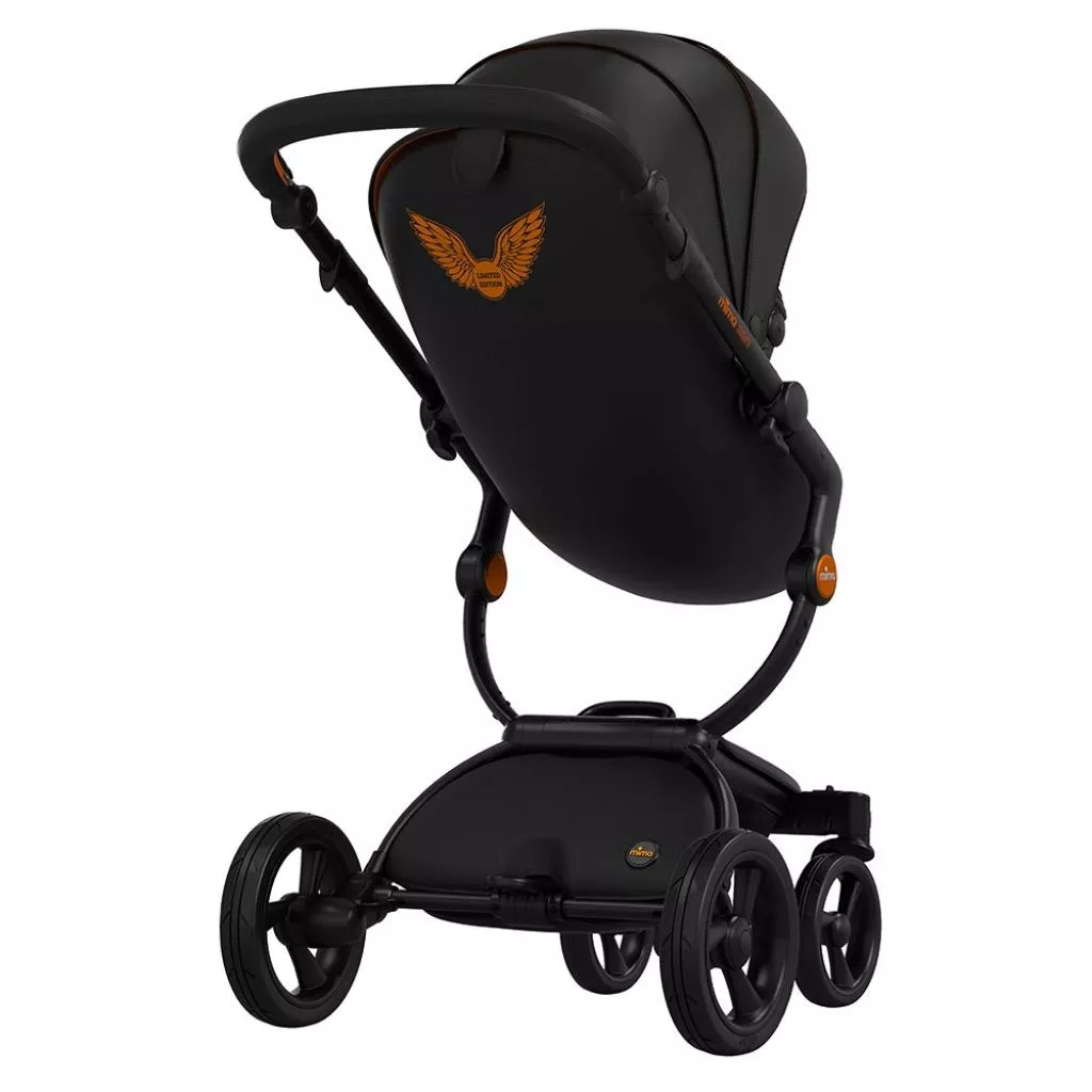 Прогулочный модуль, люлька и все дополнительные аксессуары в комплекте выполнены в едином стиле. Верх коляски – черная эко-кожа высокого качества, внутреннее пространство заполнено сочным оранжевым цветом. Спинка модуля и сумка для мамы украшена символикой лимитированной серии. Еще одна особенность новенькой коляски Mima – полностью черные диски.