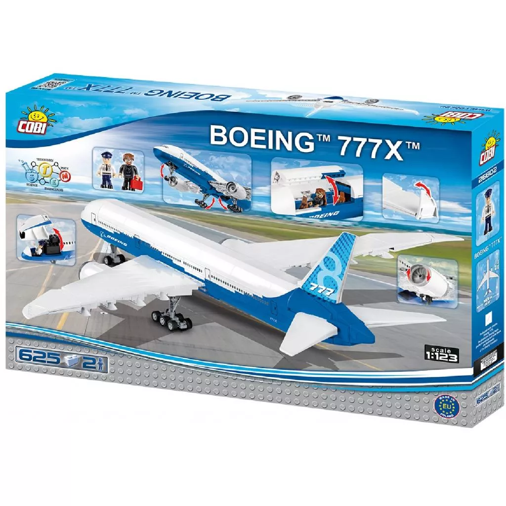 Модель пассажирского самолета Boeing 777X имеет много движущихся частей, таких как: открывающаяся кабина, в которой может быть размещена фигура пилота, вращающиеся колеса, которые можно выдвинуть из шасси, вращающиеся компоненты двигателя, движущиеся части крыльев, а также открывающаяся пассажирская палуба, где можно разместить фигурку пассажира в креслах бизнес класса. В комплект входят фигурки пассажира и пилота.