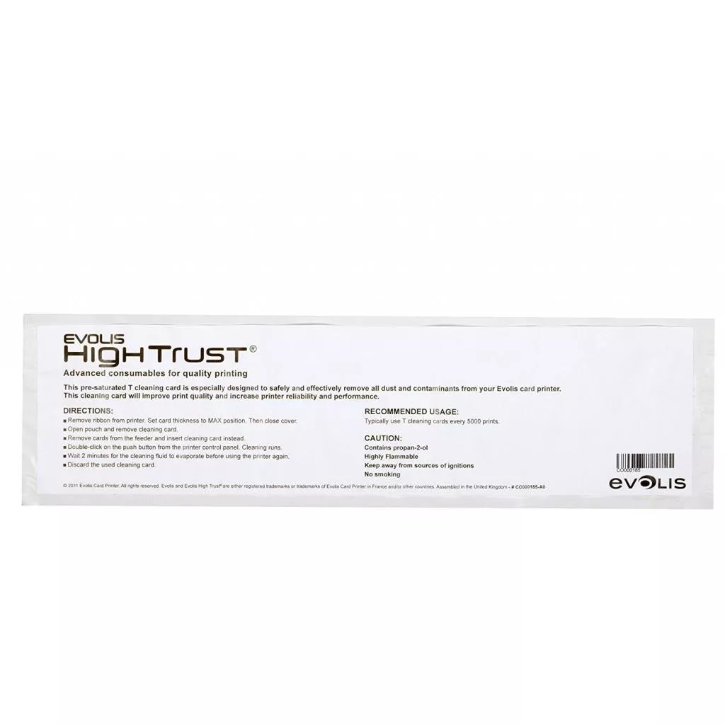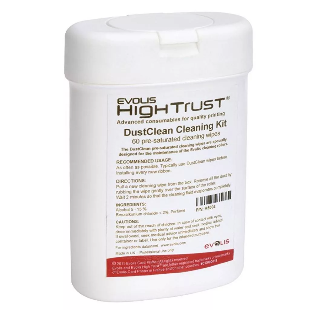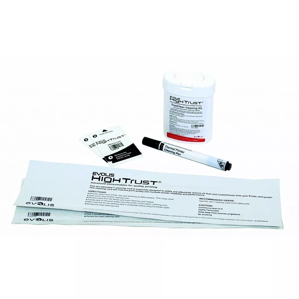 Набор для чистки принтера Evolis Cleaning Kit ACL002. Комплектация: 2 влажные карты типа 'T', 2 клейкие карты, чистящий карандаш, 60 салфеток. Для принтеров серий: Securion, Quantum2, Primacy, Zenius, Pebble4, Dualys3, Tattoo2.
