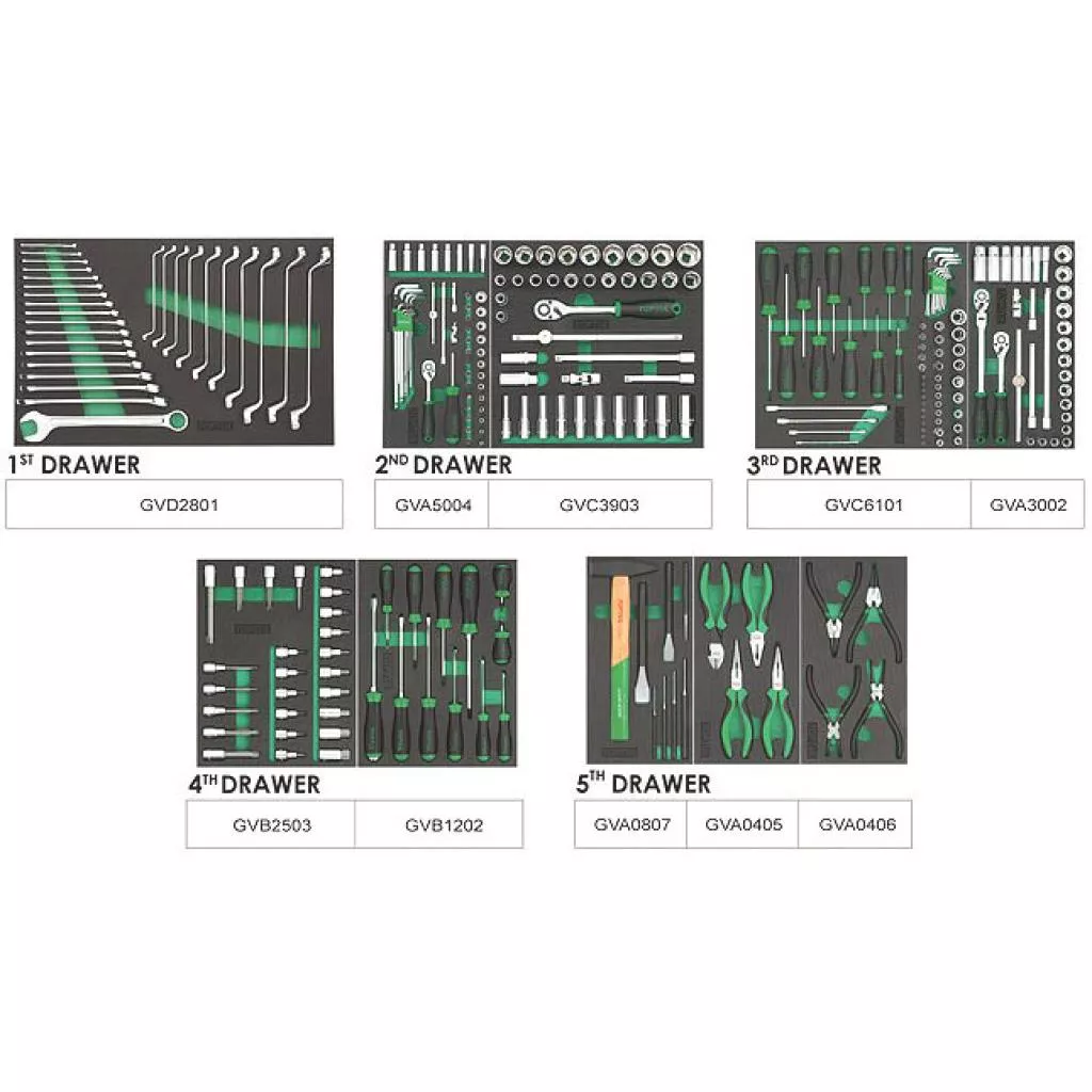 | Комплектация набора | биты, воротком с шарниром, вороток, гаечные ключи, держатель для бит, инструменты для работы с торцевыми головками, кардан шарнирный, молоток, отвертки, переходник для головок, пробойник, торцевые головки, Трещетка, удлинитель, шарнирно-губцевый инструмент, шестигранные/звездообразные ключи |