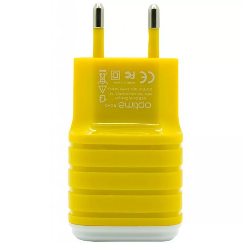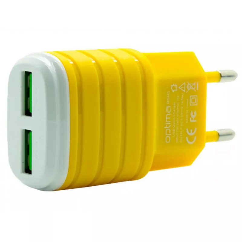 Сетевое зарядное устройство Optima 2*USB (2.1A) Yellow (40810) идеально подходит для питания и зарядки аккумуляторной батареи вашего мобильного телефона, планшета, фотоаппарата от сети переменного тока 220В.