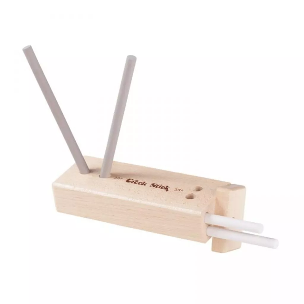 Среднезернистые стержни применяются для затачивания, а мелкозернистые - для правки и полировки, фиксированные углы заточки 20 и 25 градусов. Для хранения стержней предусмотрен специальный отсек, расположенный в деревянной подставке.