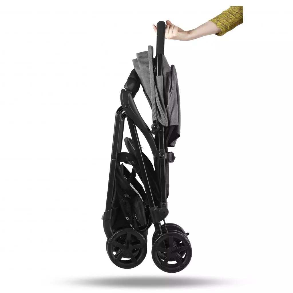 Легкая и компактная коляска для путешествий удобно складывается при помощи одной руки. Благодаря инновационной системе наклона спинки можно выбрать любой угол до положения лежа. Для более плавной езды по неровной дороге достаточно зафиксировать передние колеса.