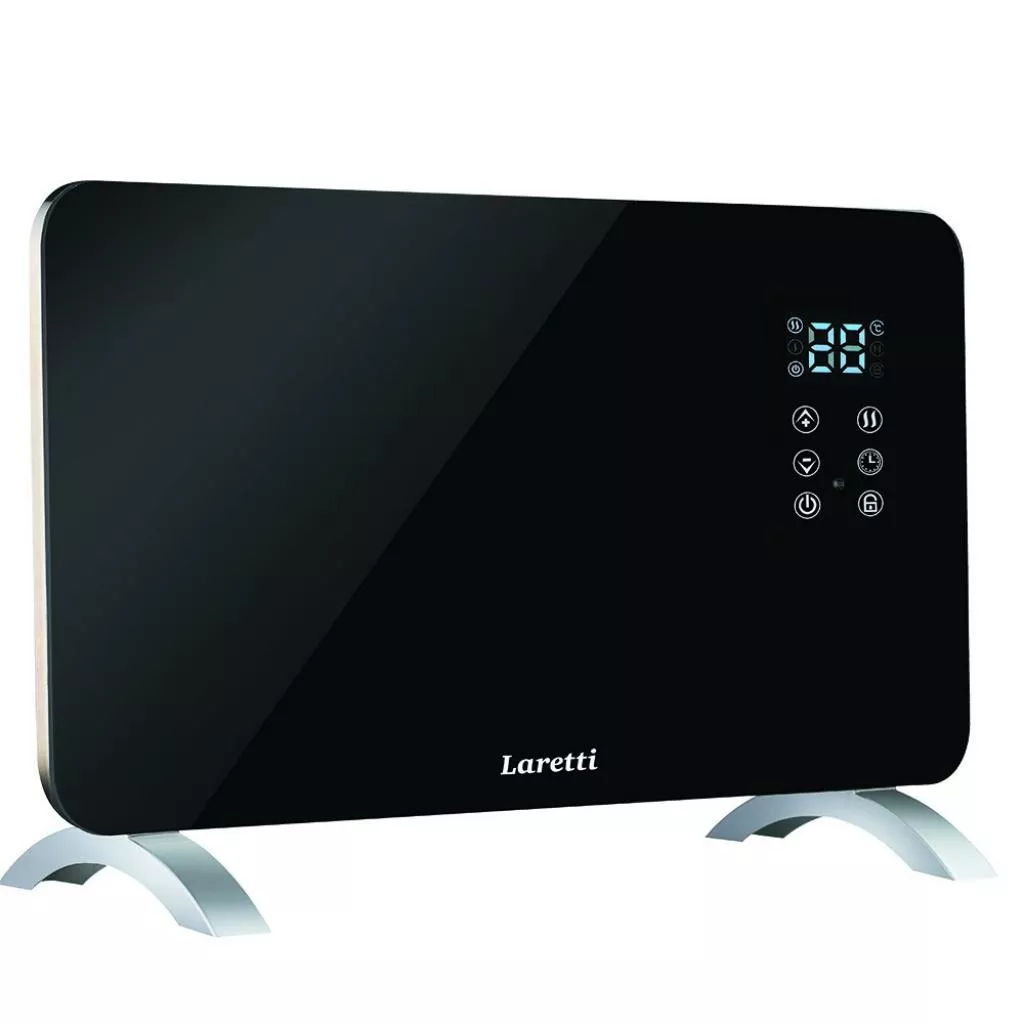Конвекционный нагреватель LARETTI LR-HT0315 с X-образным нагревательным элементом мощностью 1500 Вт, со стеклянной панелью, двумя режимами питания, светодиодным дисплеем, сенсорным управлением и пультом дистанционного управления.