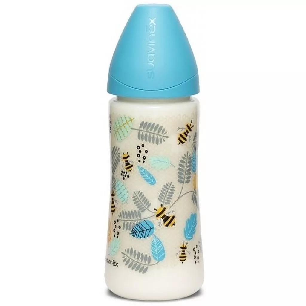 Бутылочка для кормления Suavinex (Суавинекс) Крылатые истории с круглой соской идеально подойдет для кормления малыша от 4 месяцев.