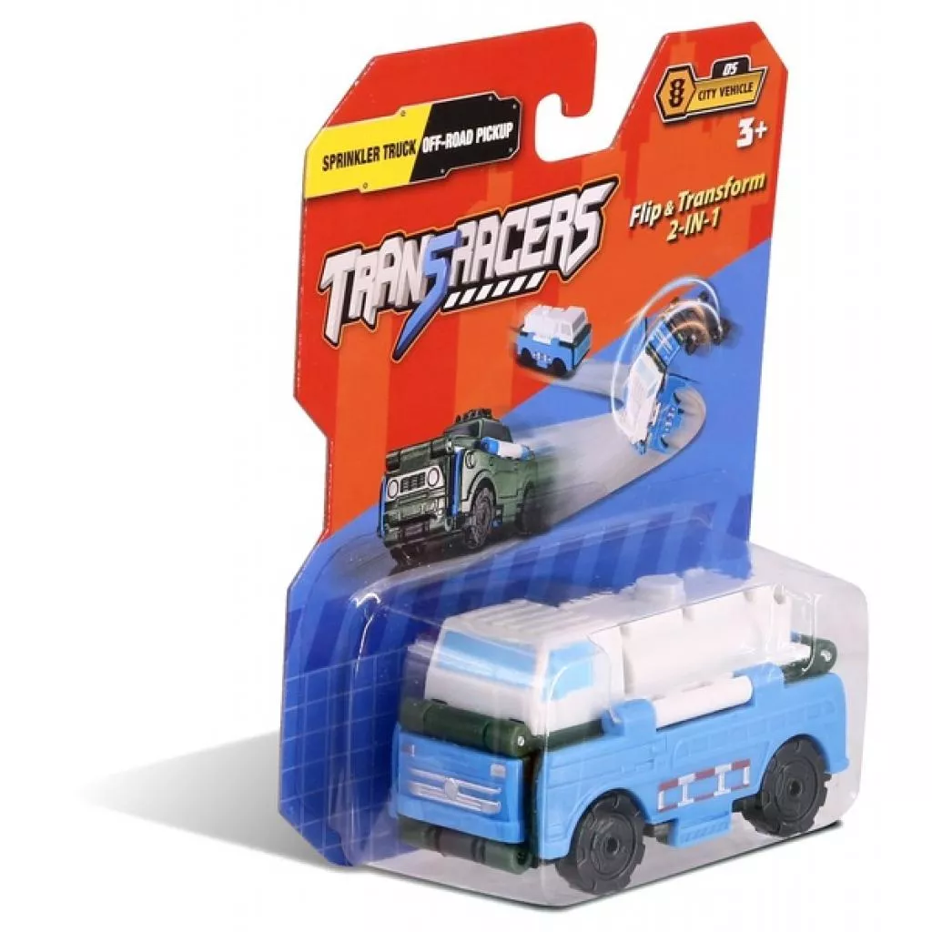 Одно движение руки и машинка перевертыша TransRacers Sprinkler Truck & Off-road Pickup превращается из пикап-внедорожник в игрушечную автоцистерну. Модель легко трансформируется, предоставляя все новые сценарии для игр. Яркий и привлекательный дизайн, надежная и безопасная конструкция – все это игрушечные машинки TransRacers.