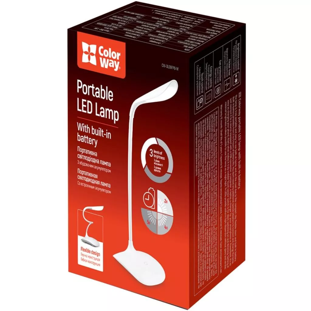 Портативная светодиодная лампа ColorWay со встроенным аккумулятором. Элегантная компактная конструкция лампы с гибкой ножкой и встроенным аккумулятором делает эту лампу по настоящему портативной и удобной как в использовании, так и в переносе в сумке. Встроенный аккумулятор, обеспечивает от 2-х до 5-ти часов автономной работы. Для подключения и зарядки Вам не потребуются дополнительные специальные адаптеры, достаточно подключить лампу к источнику, оснащенному разъемом USB: компьютер, ноутбук, зарядное устройство для смартфона или PowerBank. Это также просто, как зарядить телефон, что делает лампу по настоящему мобильной! Сенсорная кнопка для бесшумного включения и регулировки яркости. Установка минимальной яркости дает возможность использовать лампу в качестве ночника. 14 светодиодов обеспечивают равномерное рассеивание света без бликов и без стробоскопического освещения.