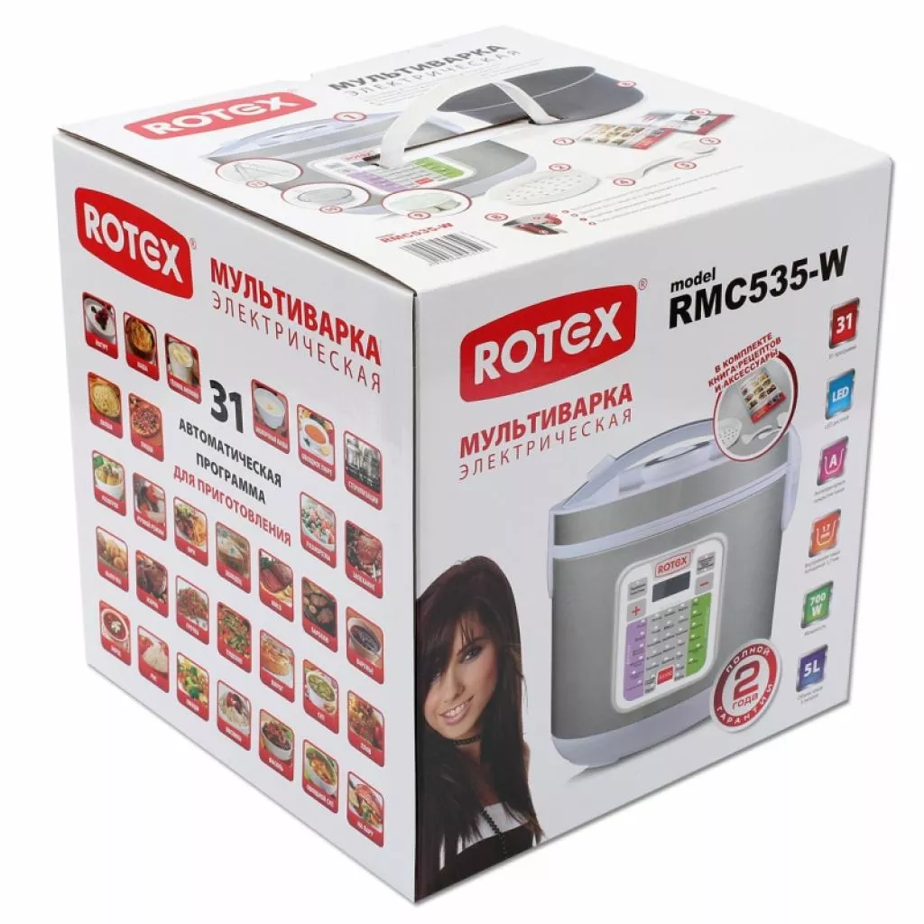 Мультиварка Rotex RMC535-W имеет качественное изготовление. Массивная чаша с антипригарным покрытием. Количество программ удовлетворит самые изысканные запросы. В данной модели используется 31 программа, поделенные для удобства использования на 3 группы. Детское меню - йогурт, каша,теплое молоко, молочная каша, овощное пюре, стерилизация; натуральное меню - рис, овощи, овсянка, фасоль, овощной суп, на пару; основное меню - 19 автоматических программ (лапша, пицца, разморозка, запекание, разогрев, ручной режим, фри, холодец, мясо, барбекю, варенье, выпечка, жарка, гречка, тушение, пирог, суп, плов, борщ). В модели присутствует таймер отсрочки на 24 часа, и функция поддержания блюда горячим. В комплекте с мультиваркой идет навесной контейнер пароварка, половник, ложка для риса, набор баночек для приготовления йогурта, щипцы и книга рецептов. Мультиварка Rotex RMC535-W порадует вас простотой управления, большим количеством программ и легкостью ухода.Рейтинг страницы: 5.0