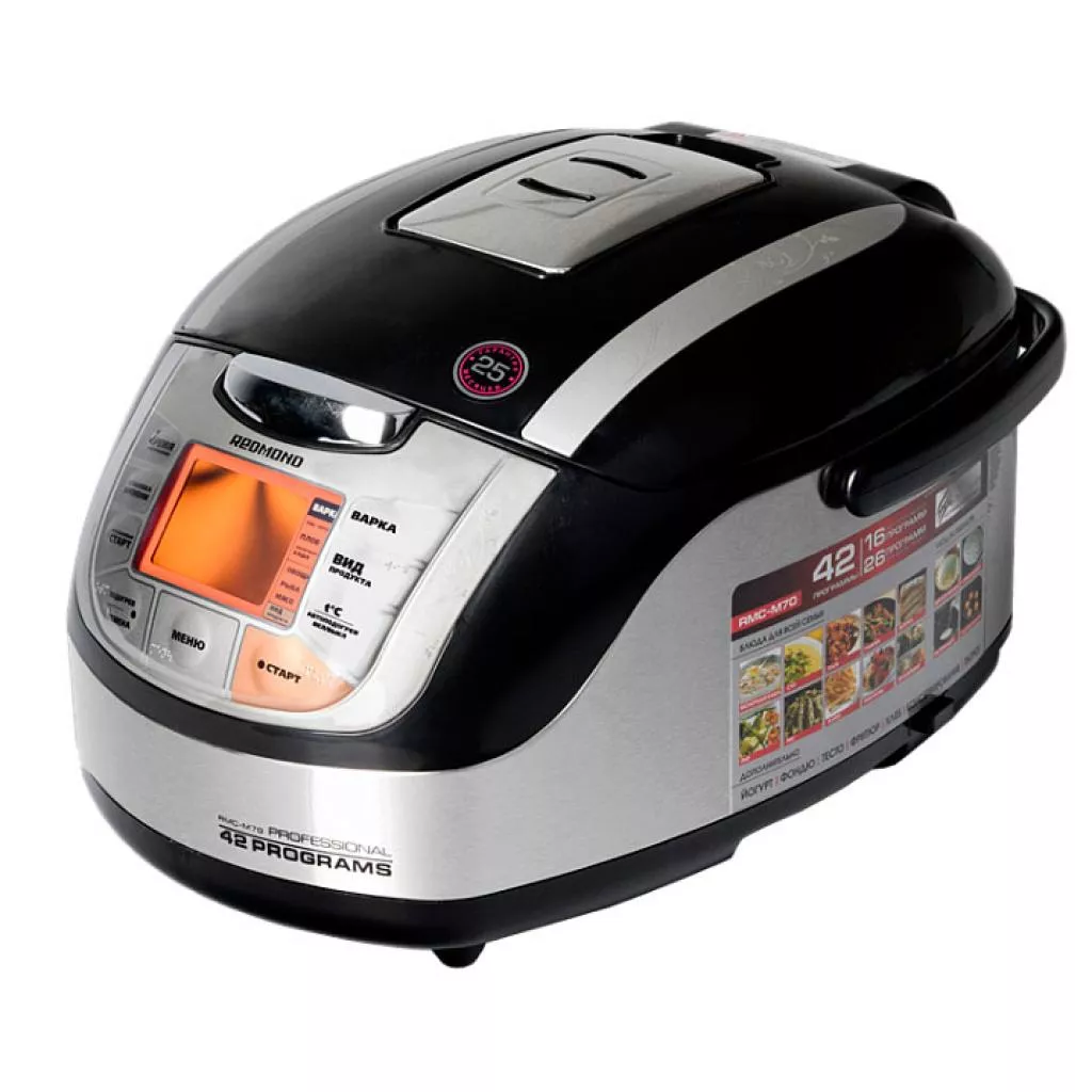 Мультиварка Redmond RMC-M70 — топ-модель в линейке мультиварок компании REDMOND. Обладая внушительным набором функций и программ приготовления, она полностью отвечает запросам самых требовательных потребителей. Но главным ее достоинством является новая версия уникальной программы «МУЛЬТИПОВАР». Возможность выбора из 26 температурных режимов значительно расширяет функциональность данной модели: «МУЛЬТИПОВАР» позволяет не только воссоздать любую программу приготовления любой мультиварки, но и открывает безграничные возможности для кулинарных экспериментов. Помимо этого в комплектацию обновленной модели входят чаша с антипригарным керамическим покрытием корейского производителя Anato®, новая книга «200 рецептов» с добавленным разделом по детскому питанию, а на основных кнопках управления появились специальные символы для слабовидящих людей. Процесс приготовления в мультиварке полностью автоматизирован. 42 программы (16 автоматических и 26 с ручными настройками) позволяют готовить блюда из мяса, птицы, рыбы и морепродуктов, вегетарианские блюда; варить каши, супы, гарниры, макароны и плов; жарить во фритюре, делать йогурты, готовить выпечку, десерты и напитки. Трехмерный нагрев чаши позволяет равномерно распределить тепло и удалить излишний конденсат во время приготовления. Мультиварку Redmond RMC-M70 уже по достоинству оценили и рекомендуют профессиональные повара. Благодаря трем нагревательным элементам, расположенным на днище, по периметру чаши и в крышке, в процессе работы происходит более равномерное распределение тепла по всему объему продукта. Это позволяет подобрать оптимальную температуру приготовления для каждой программы, снизить риск подгорания блюда и избавиться от избыточного конденсата, а значит, получить более качественный результат.